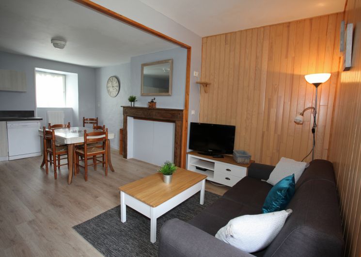 Appartement de 61m² pour 6 personnes comprenant : Au Rdc : un salon ouvert sur la cuisine (réfrigérateur/congélateur, four, micro-ondes, plaque induction, lave linge, lave vaisselle, TV), un coin nuit avec 1 lit en 140, une salle d’eau avec douche et lavabo. WC indépendant. A l’étage : une chambre avec 1 lit en 140 et une autre avec 2 lits en 90. La location bénéficie d’une cour non clôturée avec salon de jardin.