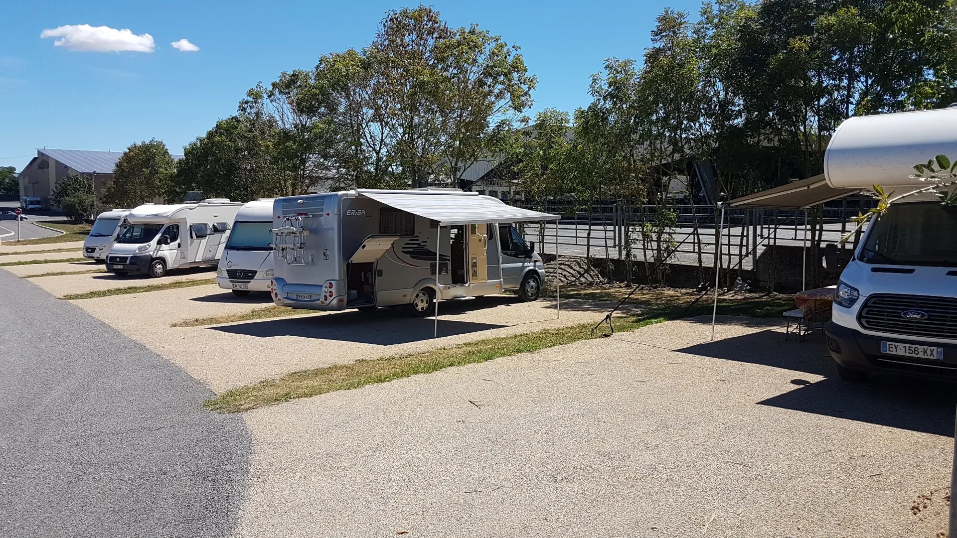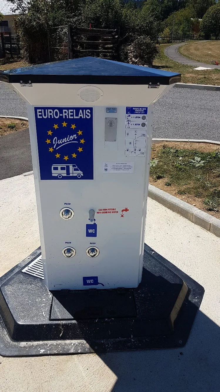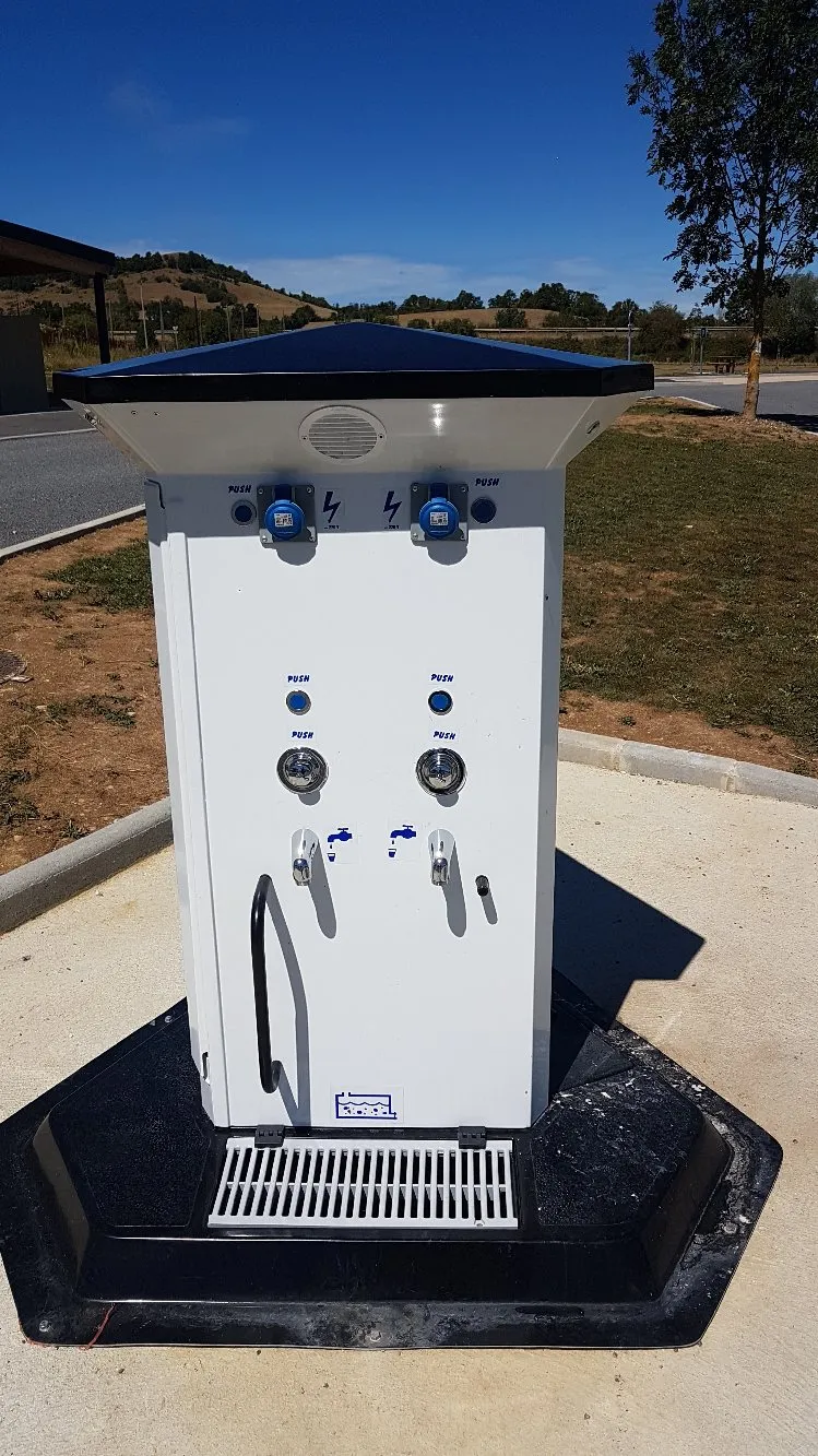 La nouvelle aire (ouverte en 2020) permet de recharger en électricité et en eau, en utilisant des jetons Euro Relais, en vente dans certains commerces et restaurants du village (4€).