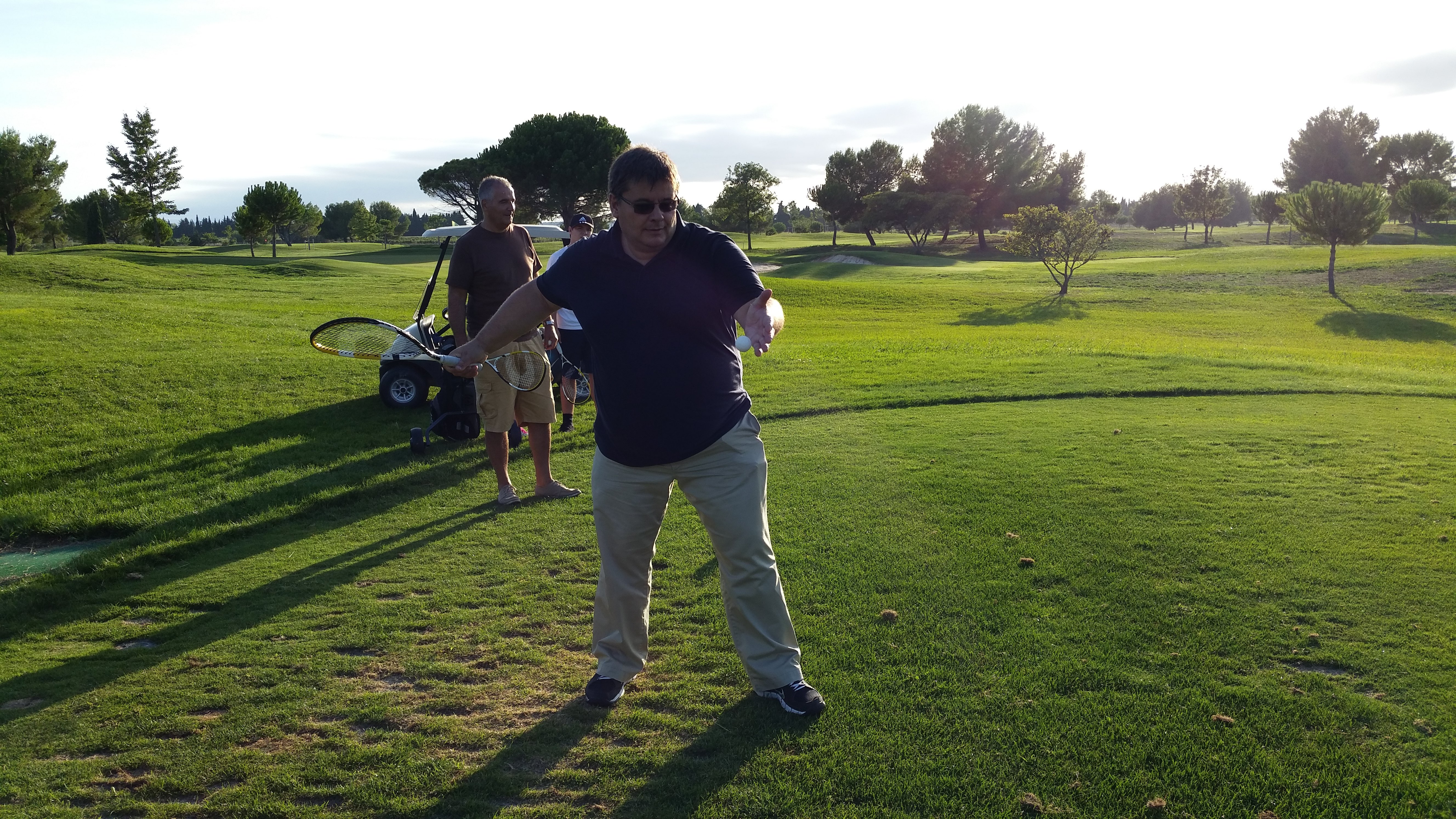 « Venez découvrir le R-Golf. Le golf avec une raquette. Une nouvelle entrée dans la pratique du golf. Beaucoup plus facile que le golf, plus rapide et moins cher. Le R-Golf se pratique sur les petits parcours de type compact ou « pitch and putt ». Vous jouerez du départ avec une raquette spéciale et la balle de R-Golf jusqu’à l’arrivée sur le green. Ensuite, vous passerez en golf traditionnel avec le putter et la balle de golf. Idéal pour les CE, Séminaires, Team Building et tout groupe de 8 à 16 personnes (32 pour Massane) Retrouvez-nous sur notre site web www.r-golf.net ou sur notre page Facebook. A très vite sur les golfs de Montpellier Massane, de Fabrègues ou de Nîmes Vacquerolles « OSEZ LE GREEN »