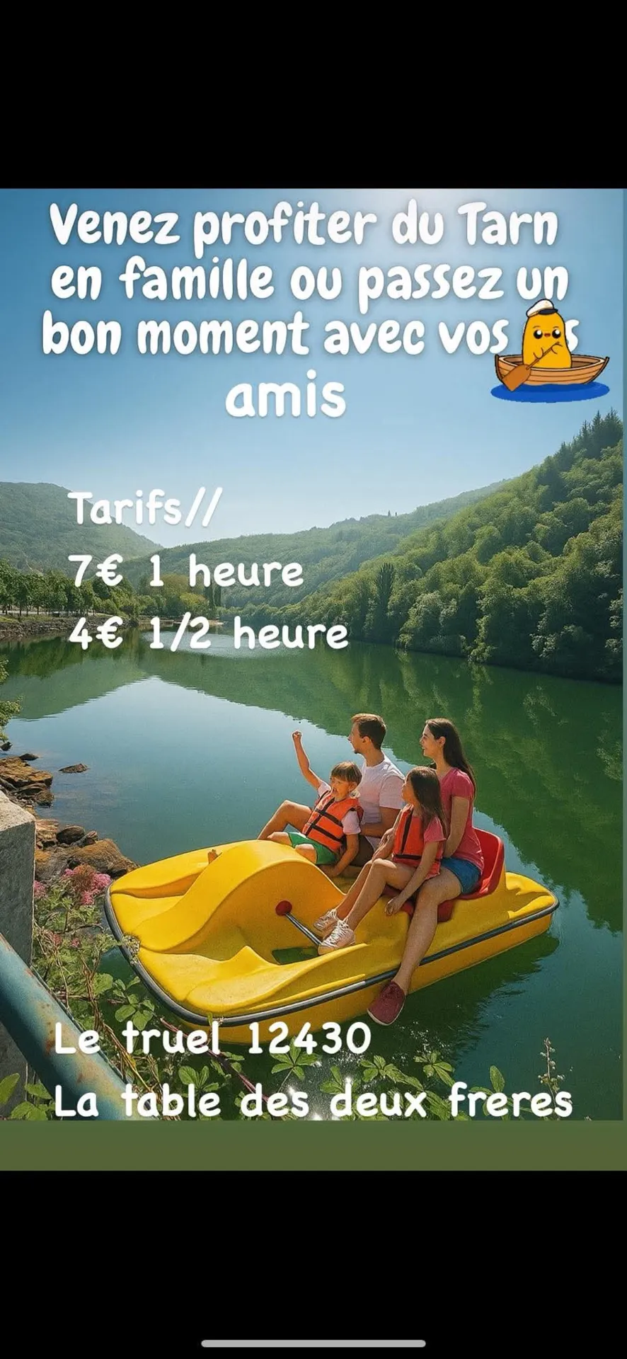 Entre falaises verdoyantes et eaux émeraude des Raspes du Tarn, embarquez pour une parenthèse rafraîchissante ! La base nautique, gérée par le restaurant La Table des Deux Frères, met à votre disposition des pédalos, idéal pour partager un moment convivial en famille ou entre amis.