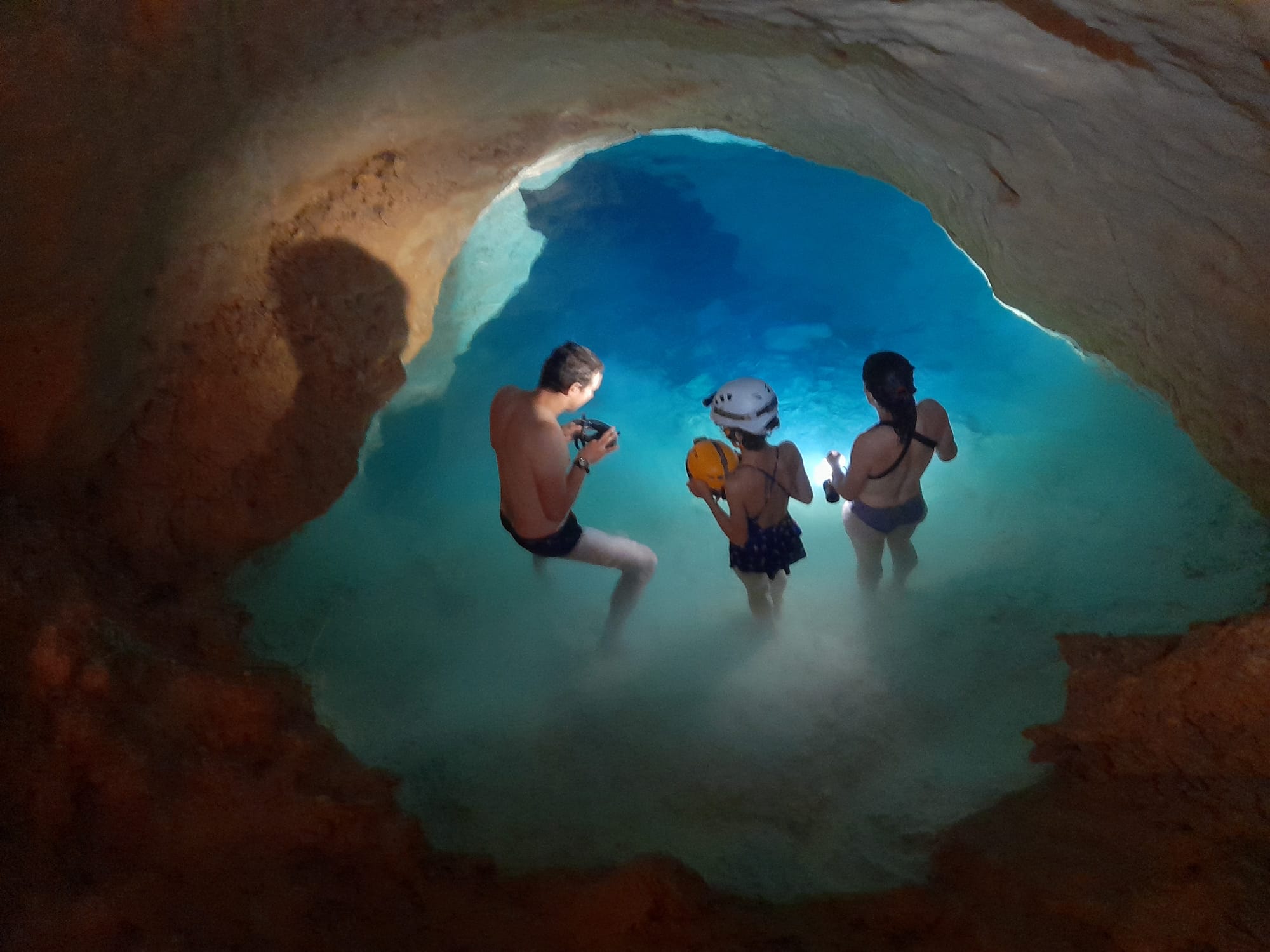 Notre belle exploration commence. C’est parti pour des passages étroits, des grandes salles…et 3 descente en rappel (maxi 15 m) et une baignade dans le siphon terminal(non obligatoire eaux a 21 degrés) !.
