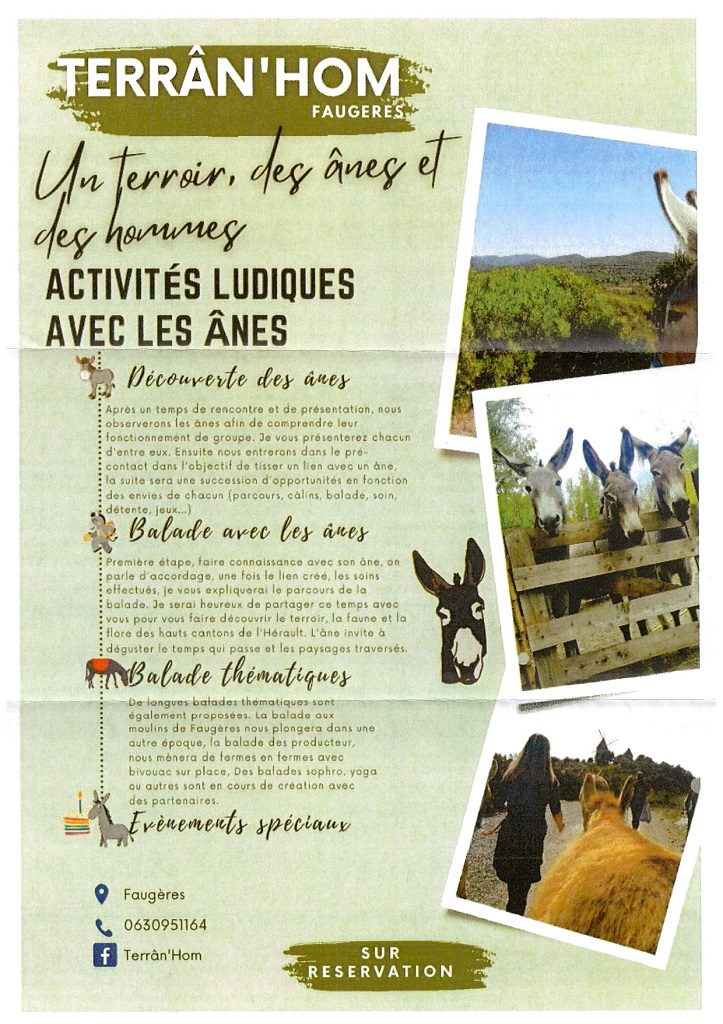 TerrÂn’Hom permet une reconnexion à la nature, à soi, et plus largement à l’humain. Cela comprend plusieurs parties qui se complètent, dont les acteurs principaux sont, vous, mes ânes et mes chevaux. Activités ludiques avec les ânes : Découverte des ânes- Balade avec les ânes – Balade thématiques – évènements spéciaux.