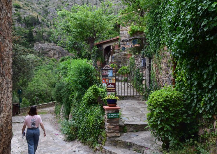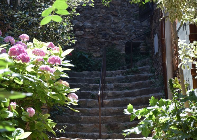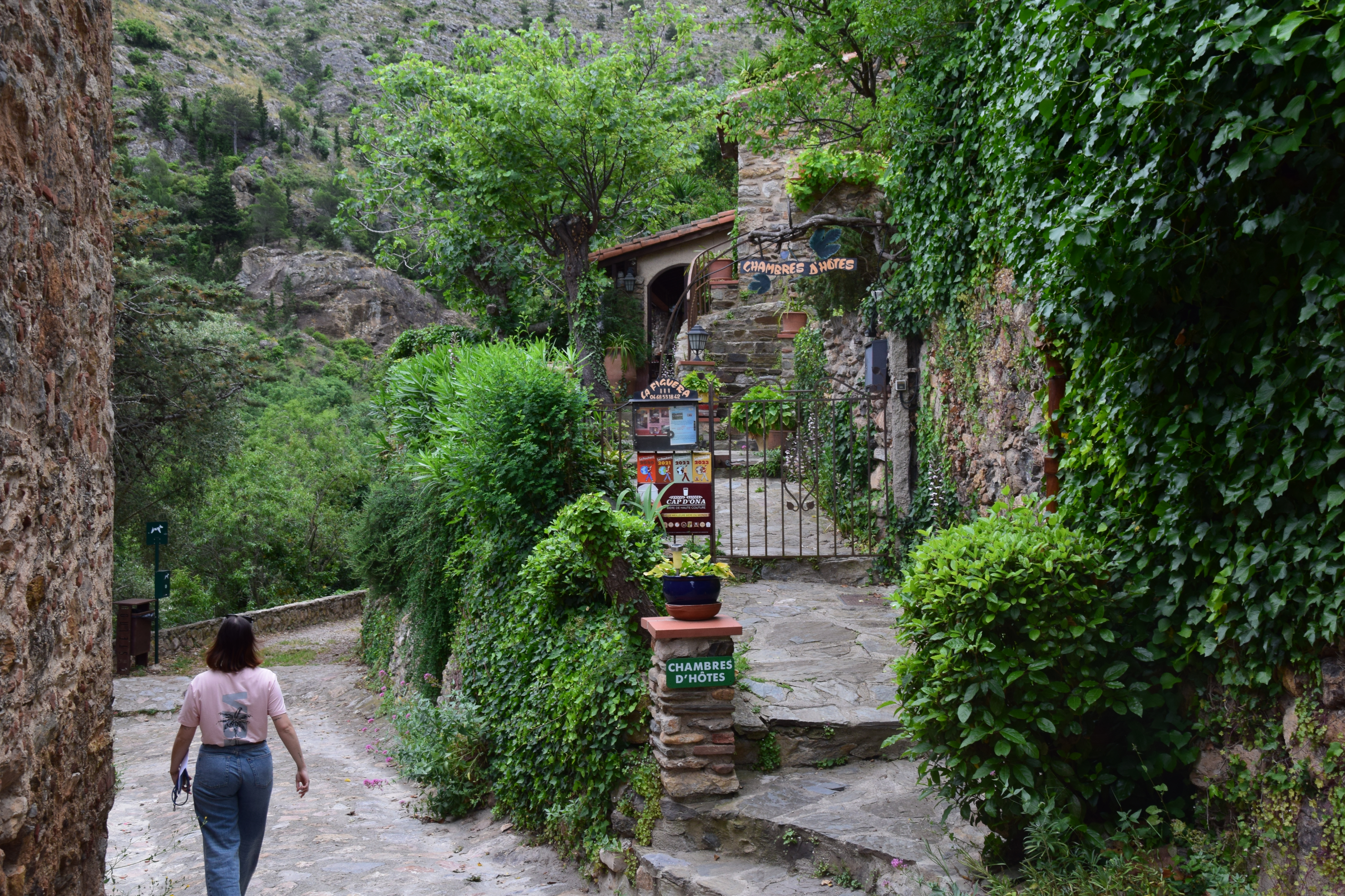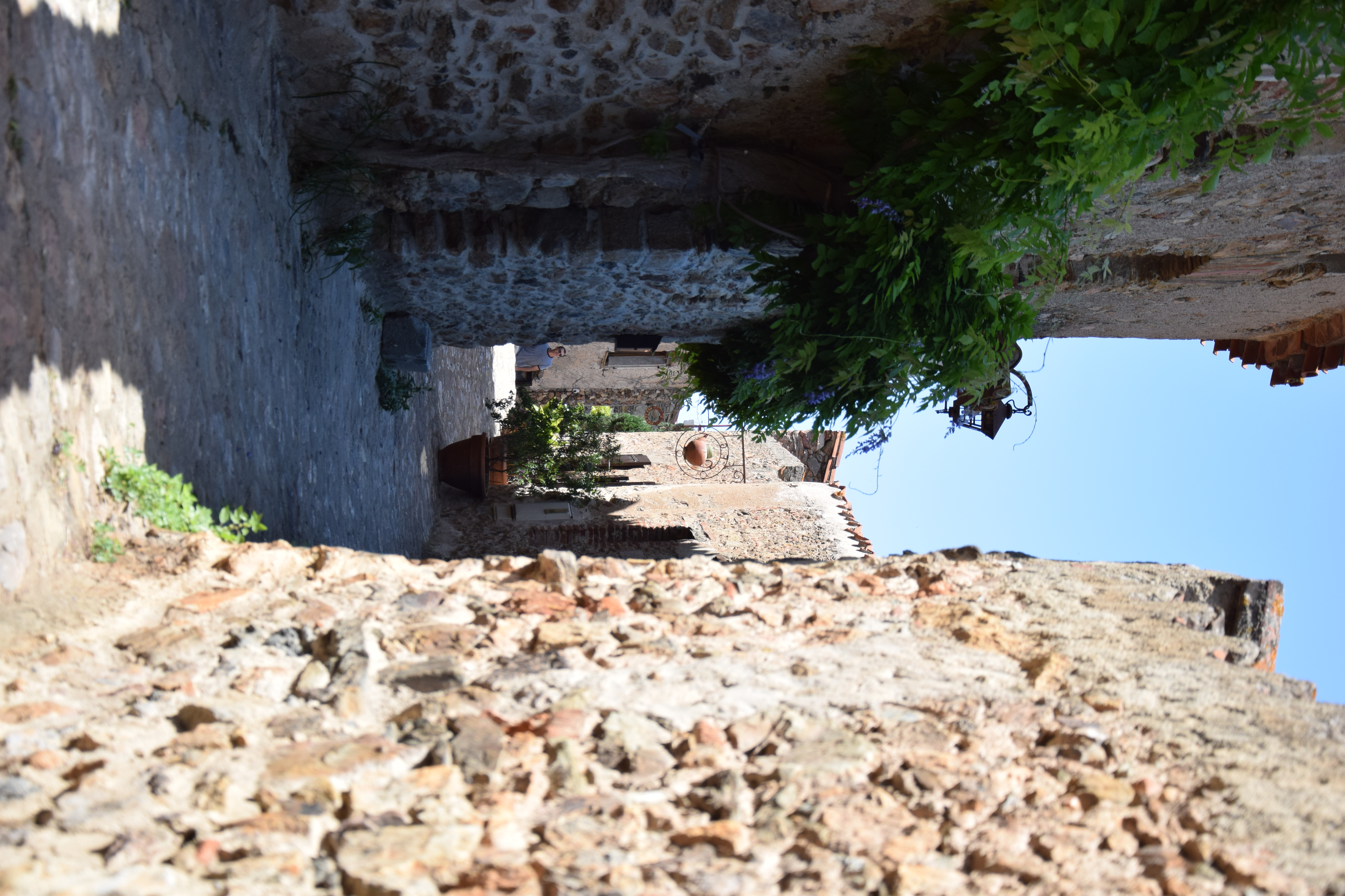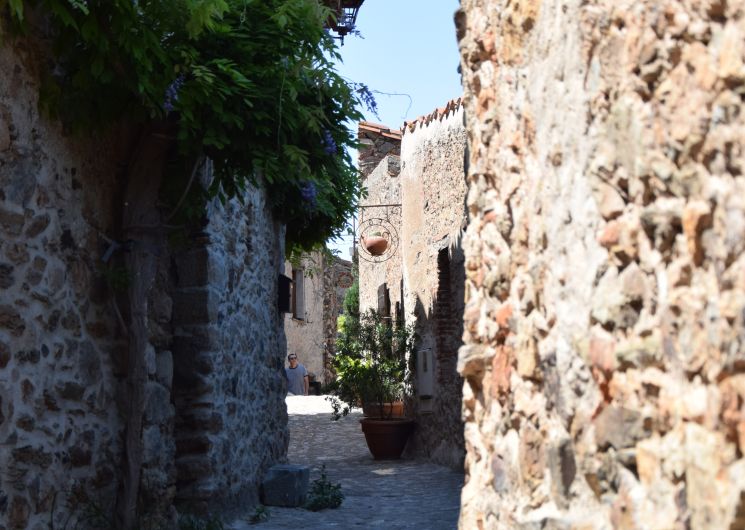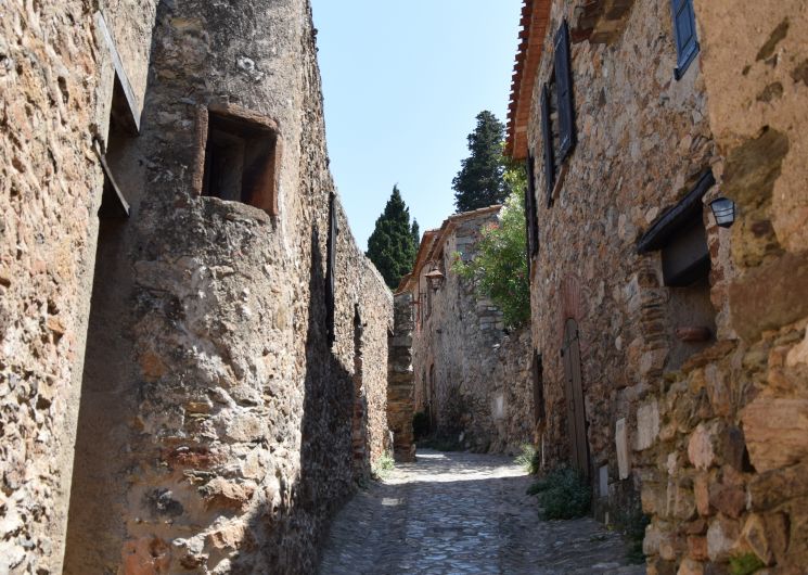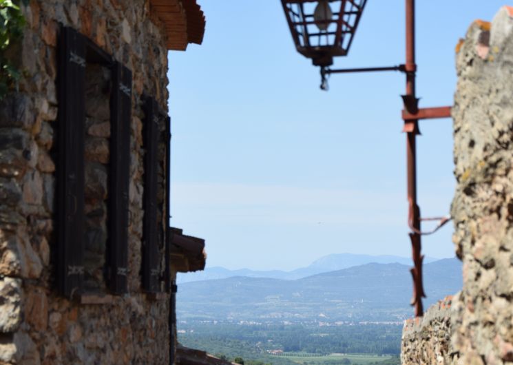 A une vingtaine de kilomètres au sud-ouest de Perpignan, Castelnou s’est calé au pied des Aspres avec, en toile de fond, le Canigou, montagne mythique des Catalans. Le village conserve encore son apparence médiévale avec ses remparts rythmés par 8 tours et 4 portes disposés aux 4 points cardinaux et sa tour de guet. Dominant le village, le château Vicomtal a du adapter sa forme pentagonale aux arêtes abruptes et irrégulières du roc qui l’accueille. Il fut construit en 990 par le Vicomte de Castelnou pour servir de base militaire à la vicomté du Vallespir. Le village est organisé autour de deux rues parallèles, le carrer d’Avall et le carrer del Migt. En le visitant on remarquera la présence de fours à pains, de génoises peintes sur le revers des tuiles…
