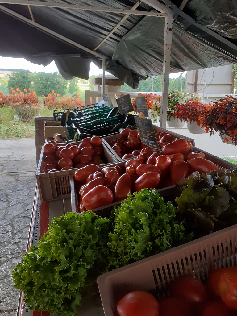 Vente à la ferme de produits de saison en fruits et légumes et plantes à massif
