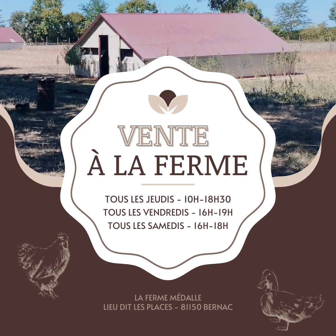 Nous proposons la vente à la ferme le jeudi 10h à 19h, le vendredi et samedi de 16h à 18h30 et sur les marchés de Gaillac et Marssac le vendredi, et d’Albi (Bd Strasbourg) le samedi.