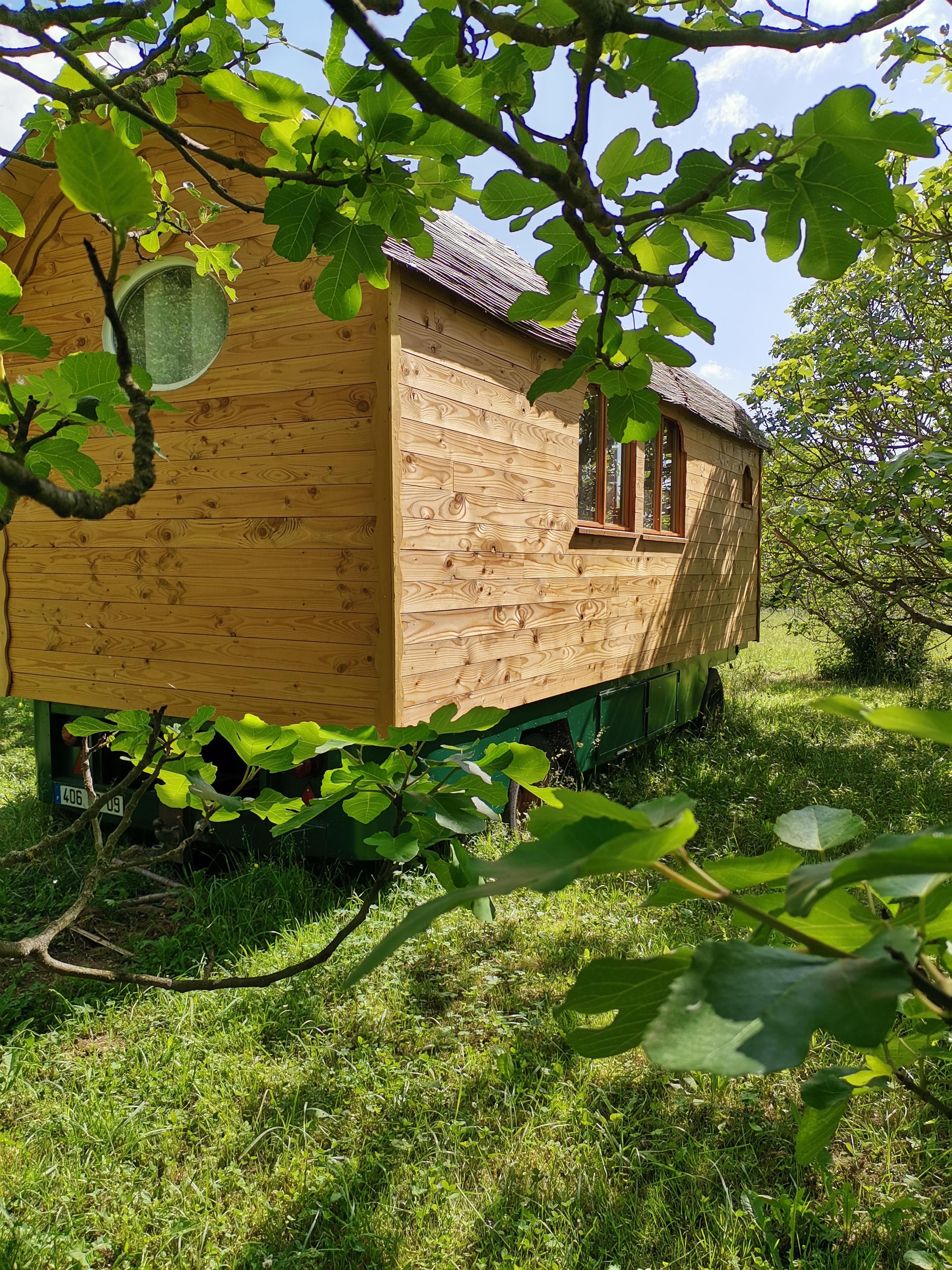Sous les figuiers, à l’écart des bâtiments et près de la rivière, nous avons installé une magnifique roulotte (2 ou 3 personnes) tout confort).
