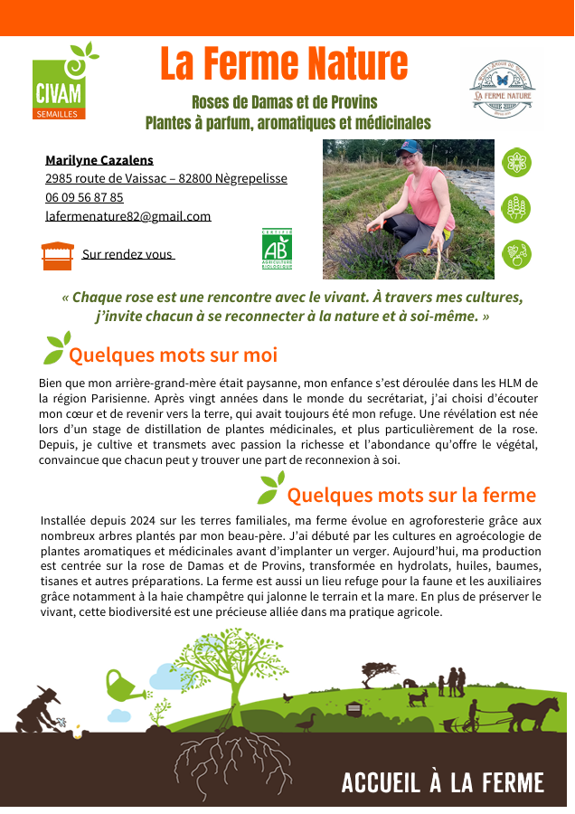 Installée depuis 2024 sur les terres familiales, ma ferme évolue en agroforesterie grâce aux nombreux arbres plantés par mon beau-père. J’ai débuté par les cultures en agroécologie de plantes aromatiques et médicinales avant d’implanter un verger. Aujourd’hui, ma production est centrée sur la rose de Damas et de Provins, transformée en hydrolats, huiles, baumes, tisanes et autres préparations. La ferme est aussi un lieu refuge pour la faune et les auxiliaires grâce notamment à la haie champêtre qui jalonne le terrain et la mare. En plus de préserver le vivant, cette biodiversité est une précieuse alliée dans ma pratique agricole.
