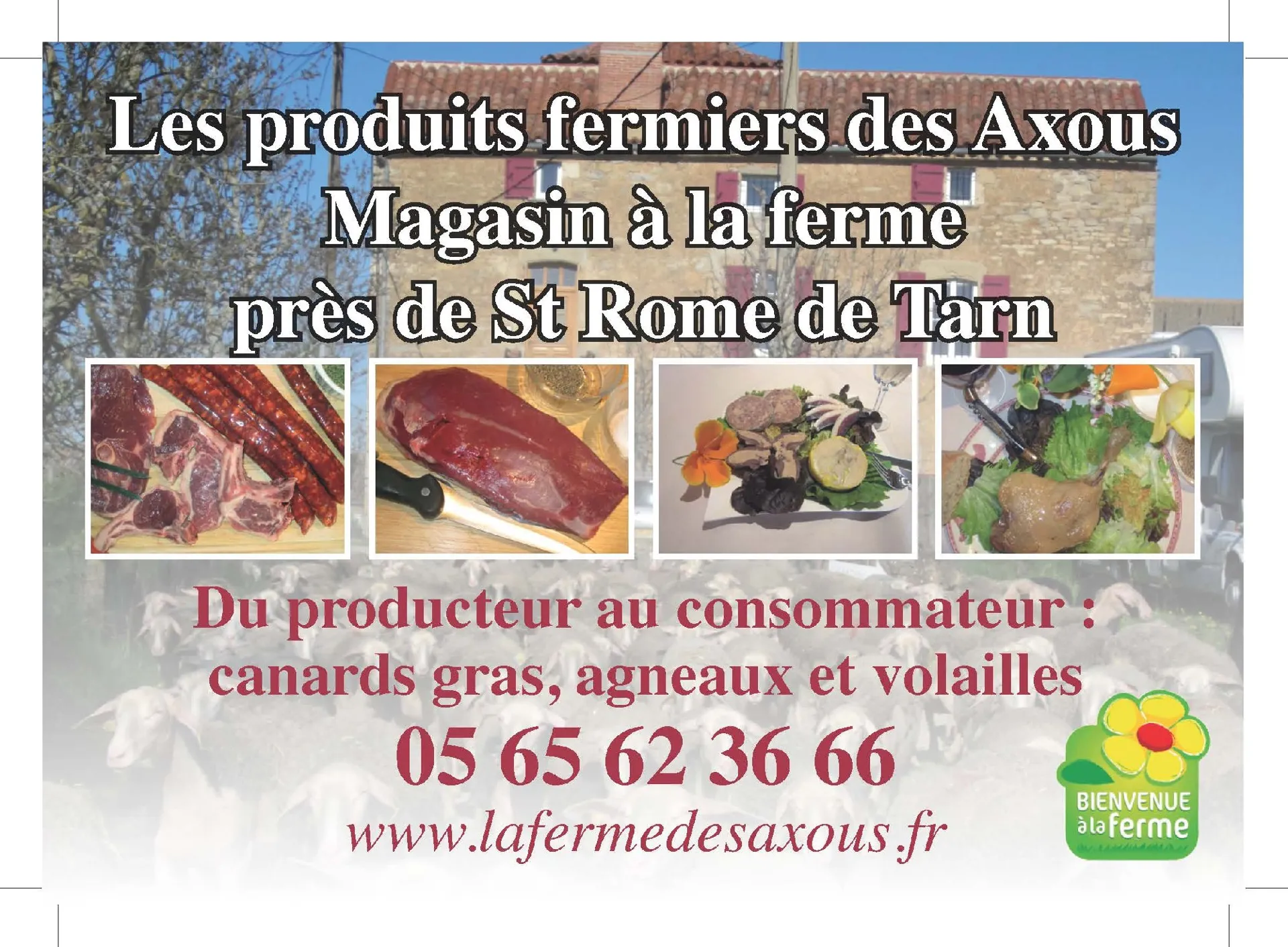 Le G.A.E.C. de La Cépède, ferme des Axous, fabrique de nombreux produits selon un savoir-faire traditionnel : foies gras, confits, magrets, plats cuisinés à base de canard, poulets et pintades prêtes à cuire, agneaux en colis ou au détail. Point de vente situé entre St-Rome de Tarn et St-Rome de Cernon. Vous pouvez nous retrouver sur les marchés du mercredi matin à Clermont-l’Hérault, le vendredi matin à Millau et le samedi matin à St-Affrique. Accueil camping-caristes.