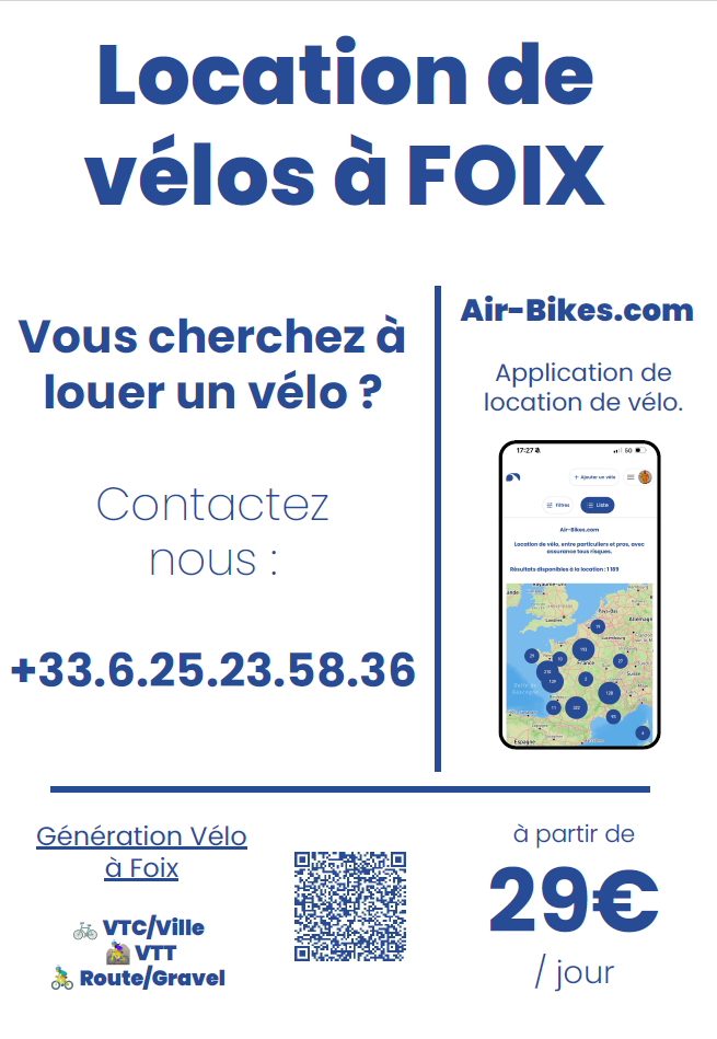 AirBikes est une plateforme de location de vélos entre particuliers et professionnels, accessible partout en France. Elle permet à chacun de proposer ou louer un vélo facilement, via une application simple et sécurisée. Paiement et assurance sont inclus, avec un large choix : VTT, vélo électrique, route, cargo, etc. C’est un outil idéal pour encourager la mobilité douce et le tourisme à vélo. À Foix, AirBikes permet aux visiteurs de trouver un vélo en quelques clics, et aux habitants de valoriser leurs équipements. Une solution flexible, locale et engagée pour découvrir la région autrement.