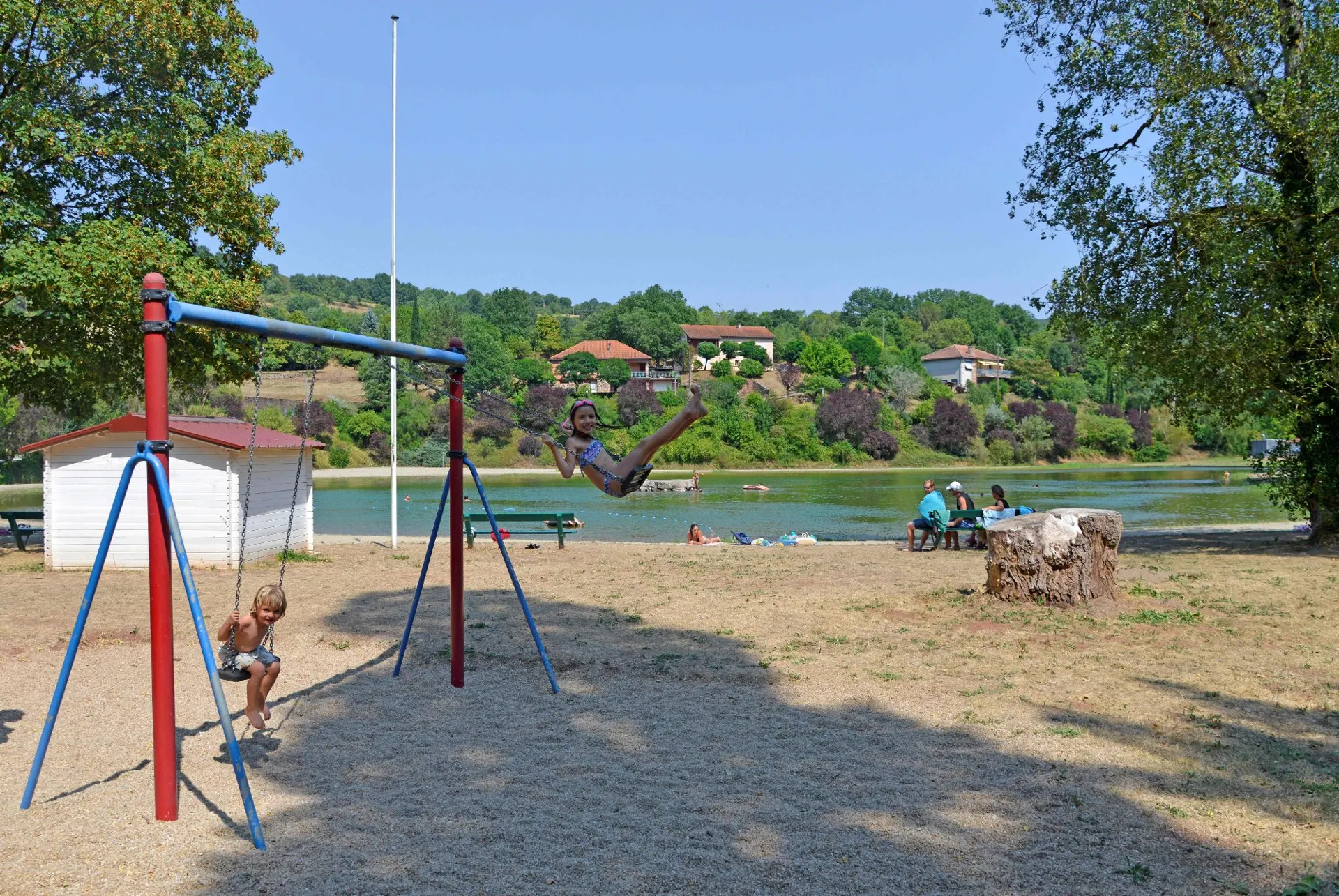 Plan d’eau, espace ombragé, barbecue, table de pique-nique, aire de jeux..