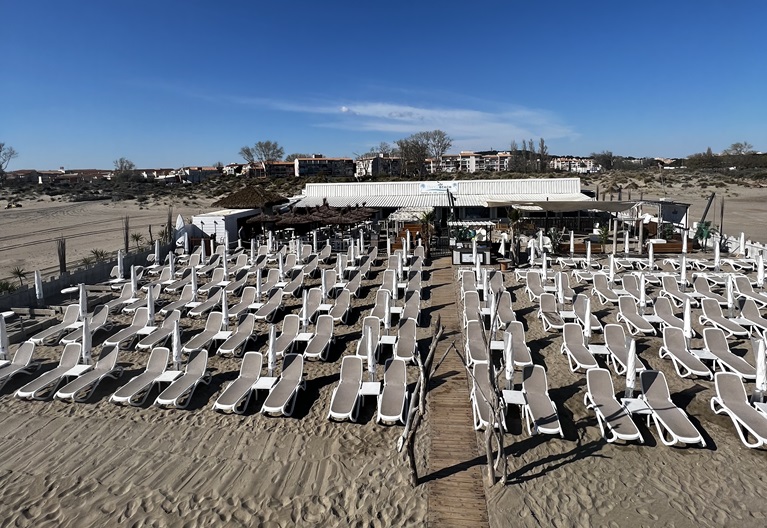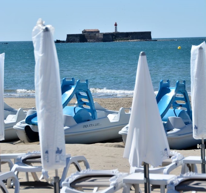 Côté mer, profitez d’une vue imprenable sur le Fort Brescou, les pieds dans l’eau et profitez de nos transats et Beds, tous équipés de parasols.