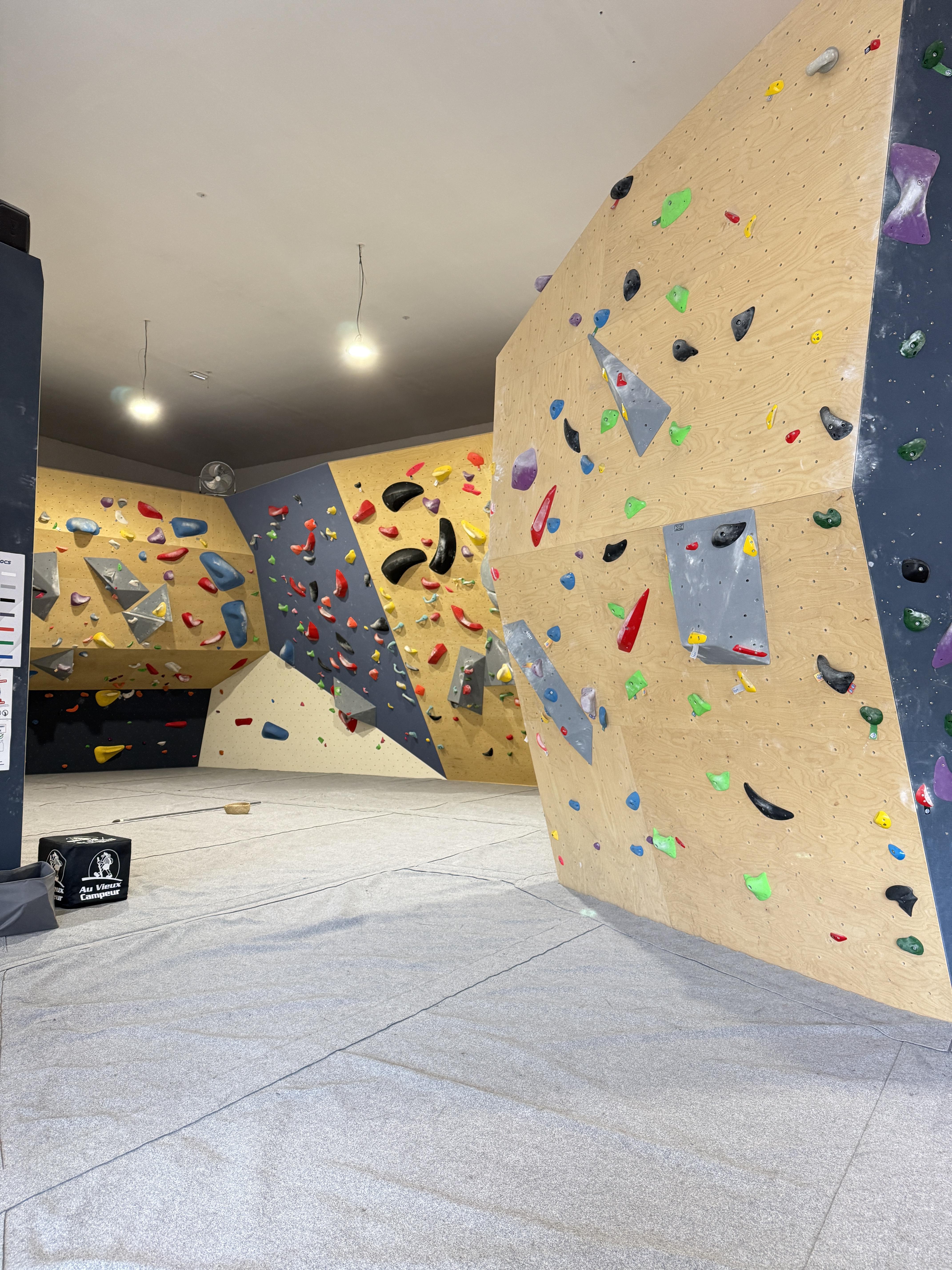 La salle dispose de plusieurs profils (dalle, dévers, grotte, mur vertical, îlot central…) avec des blocs renouvelés régulièrement pour tous les niveaux.