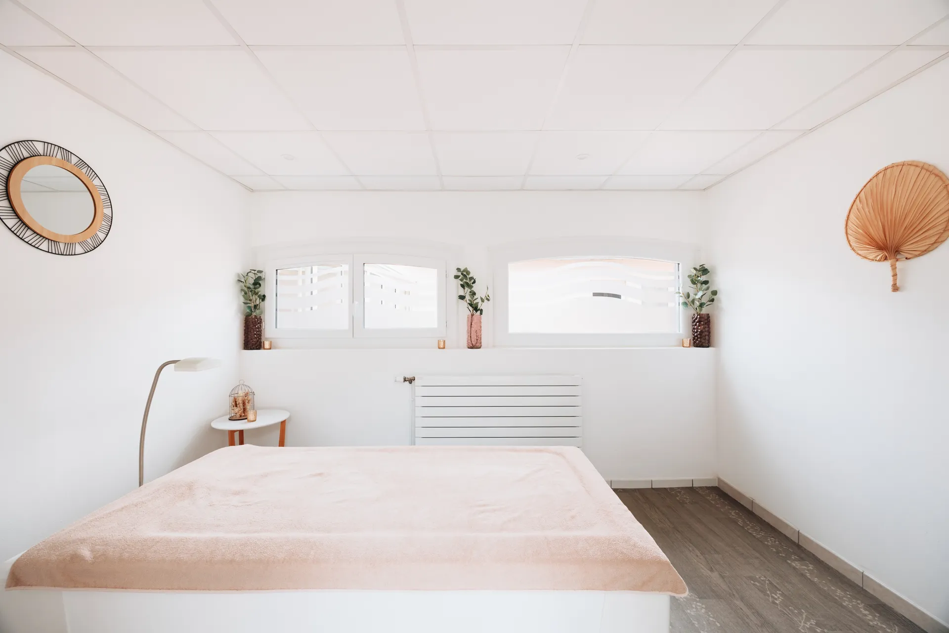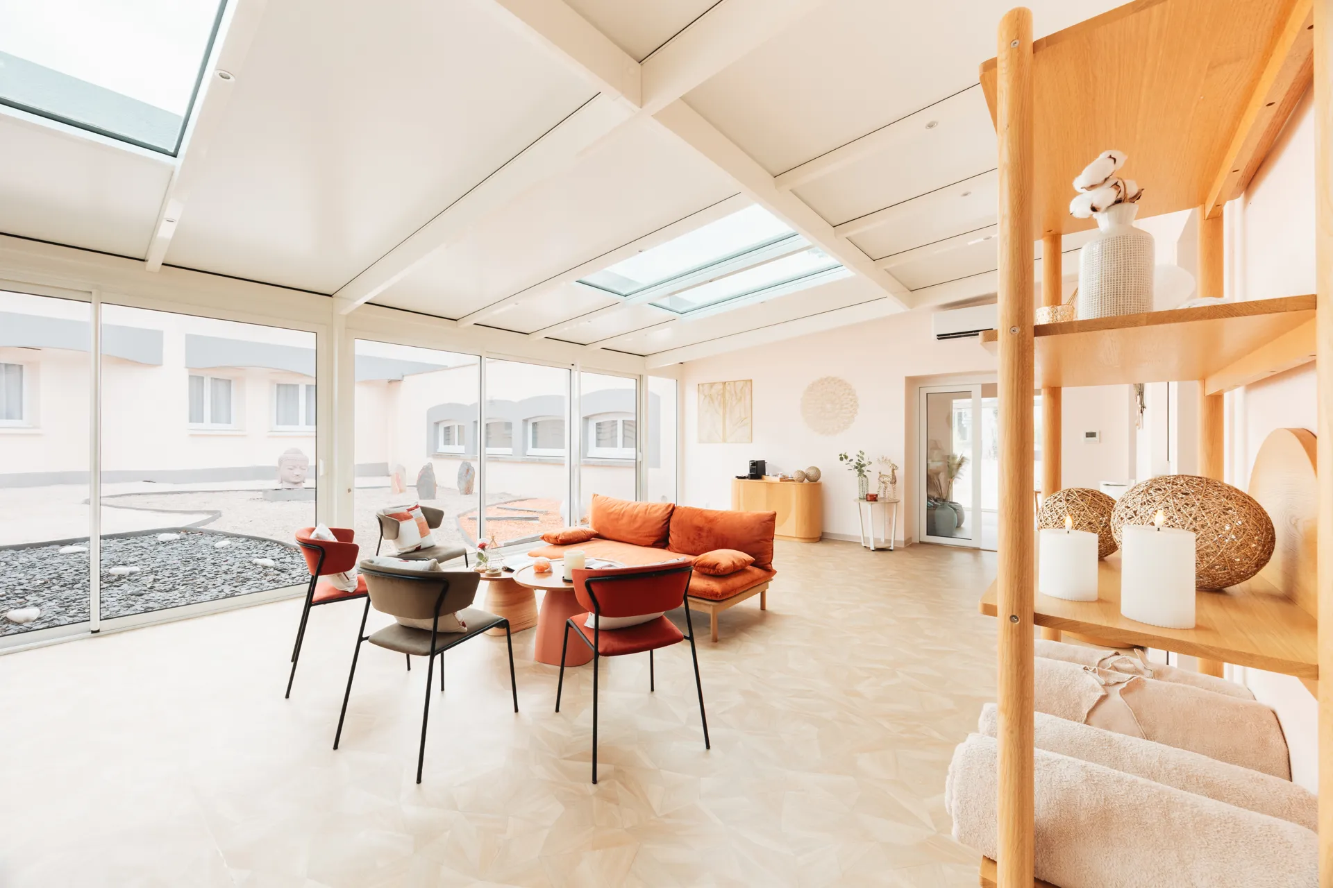 D’un espace de soins comportant une tisanerie, un jardin zen, deux cabines simples et une cabine double.
