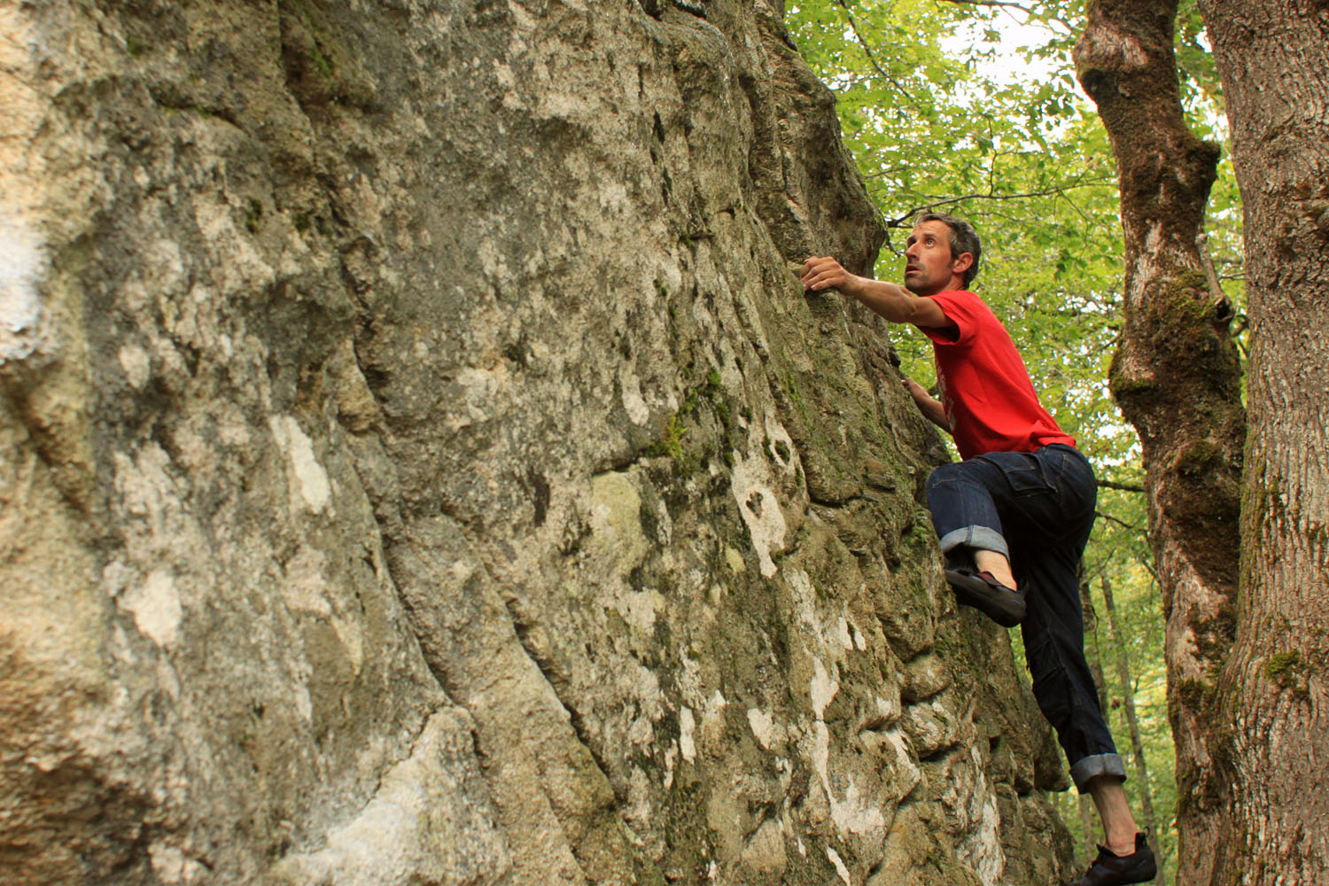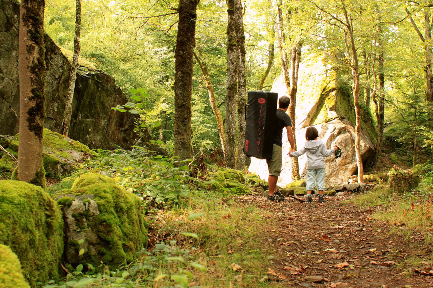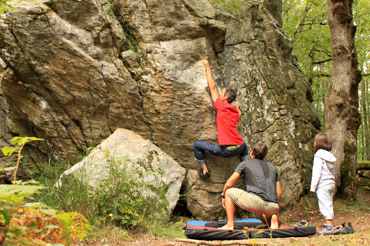A l’ombre d’une forêt de hêtres et à la fraîcheur de la rivière Oriège, le site d’escalade de blocs d’Orlu est accessible à tous les niveaux de pratique.