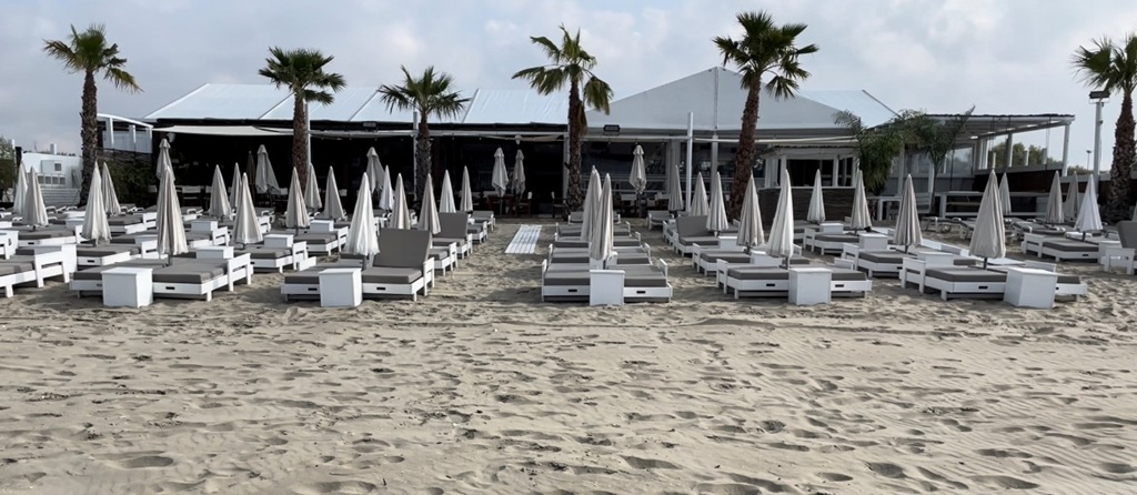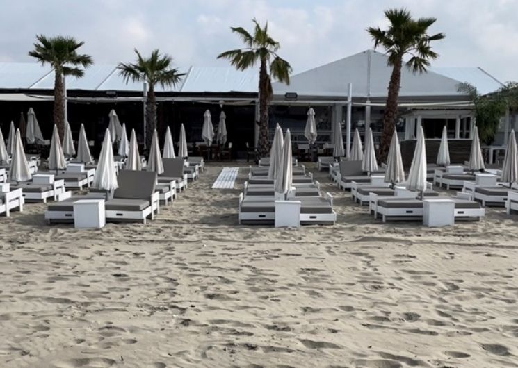 Paillotte et restaurant de plage proposant la location de matelas et parasols.