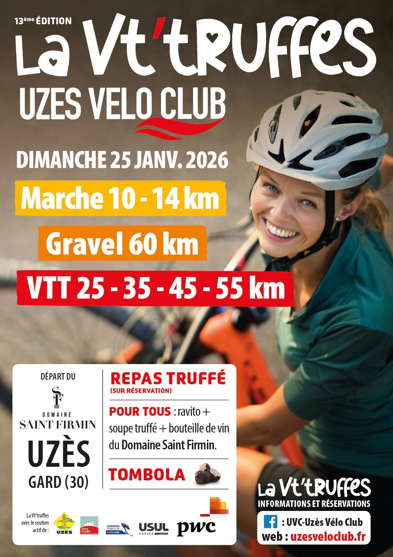L’UVC propose le 13ème VT’TRUFFES d’Uzès. Au programme : 1 parcours VTT découverte 25 km, 2 parcours VTT sport 35 et 45 km e 1 raid VTT 55 km, Gravel 60km et 2 rando-trails 10 et 14 km. À l’arrivée, soupe truffée et bouteille de vin vous attendront !