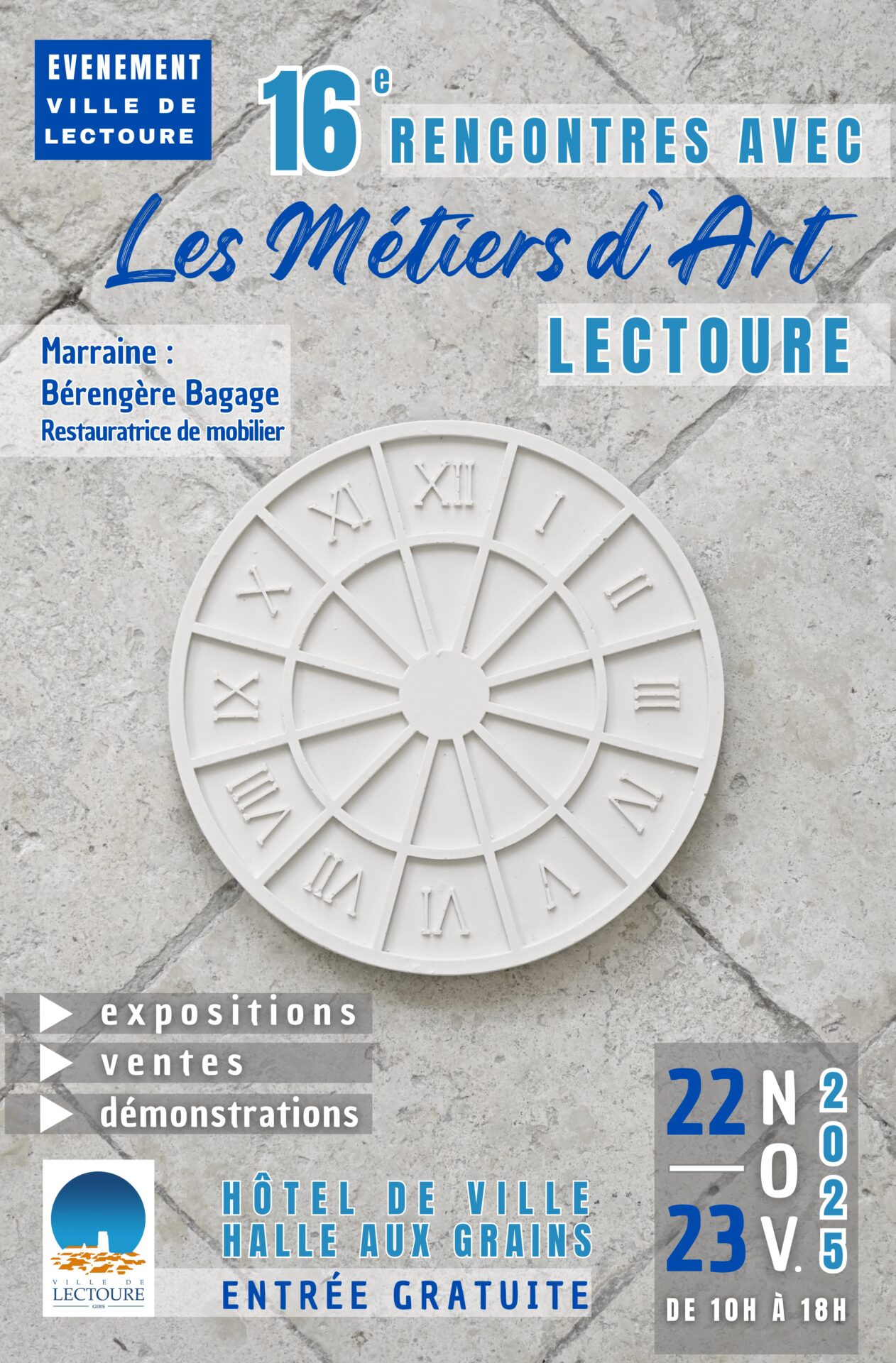 – Expositions : Une sélection d’artisans d’art installés dans les salles de l’Hôtel de ville, ainsi que sous la Halle aux grains, présenteront leurs œuvres récentes — céramique, sculpture, verrerie, travail du métal, tissage, maroquinerie, bijoux, ébénisterie, etc.