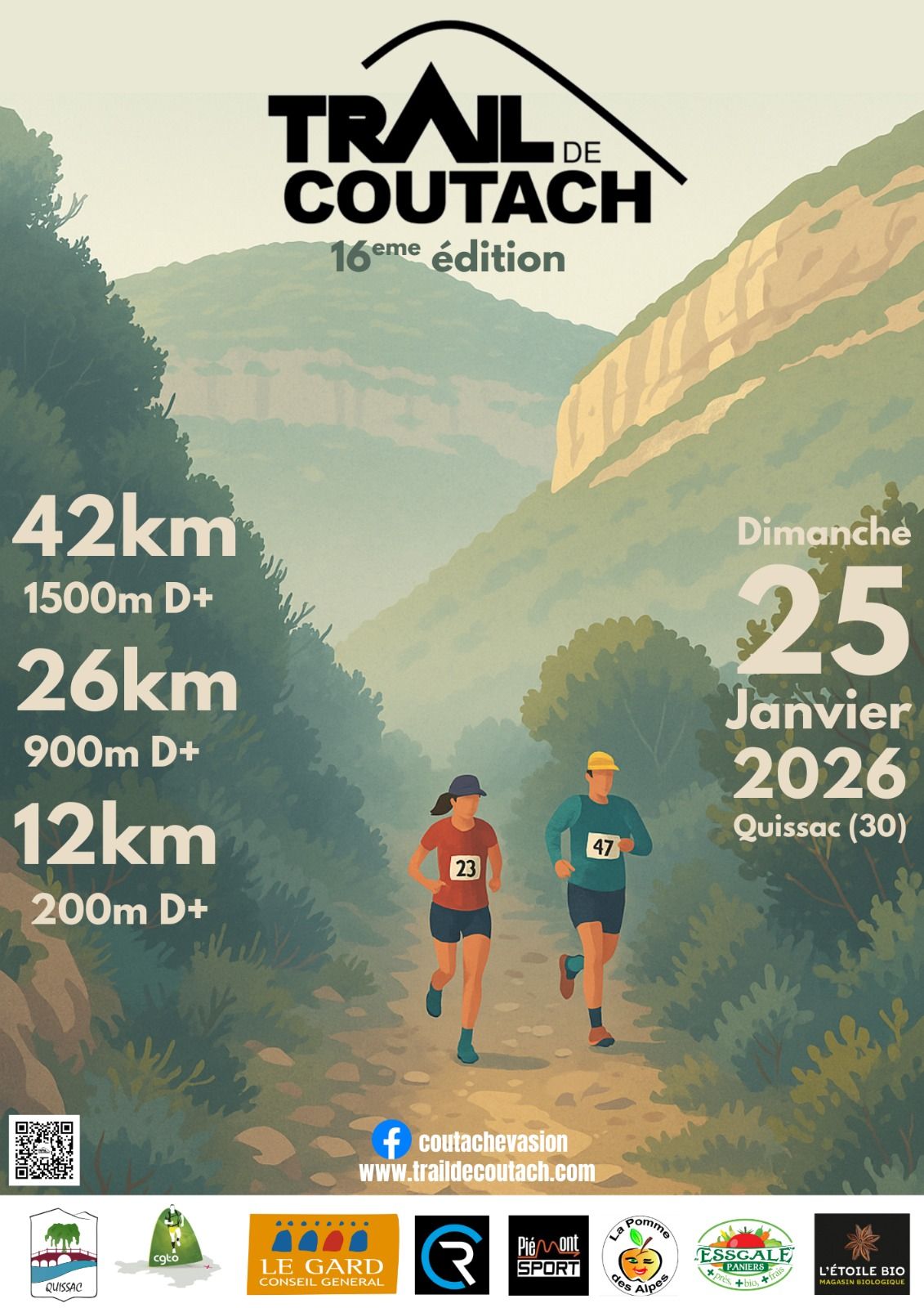 La 16ème édition du trail de Coutach aura lieu le dimanche 25 janvier 2026 à Quissac (30) !