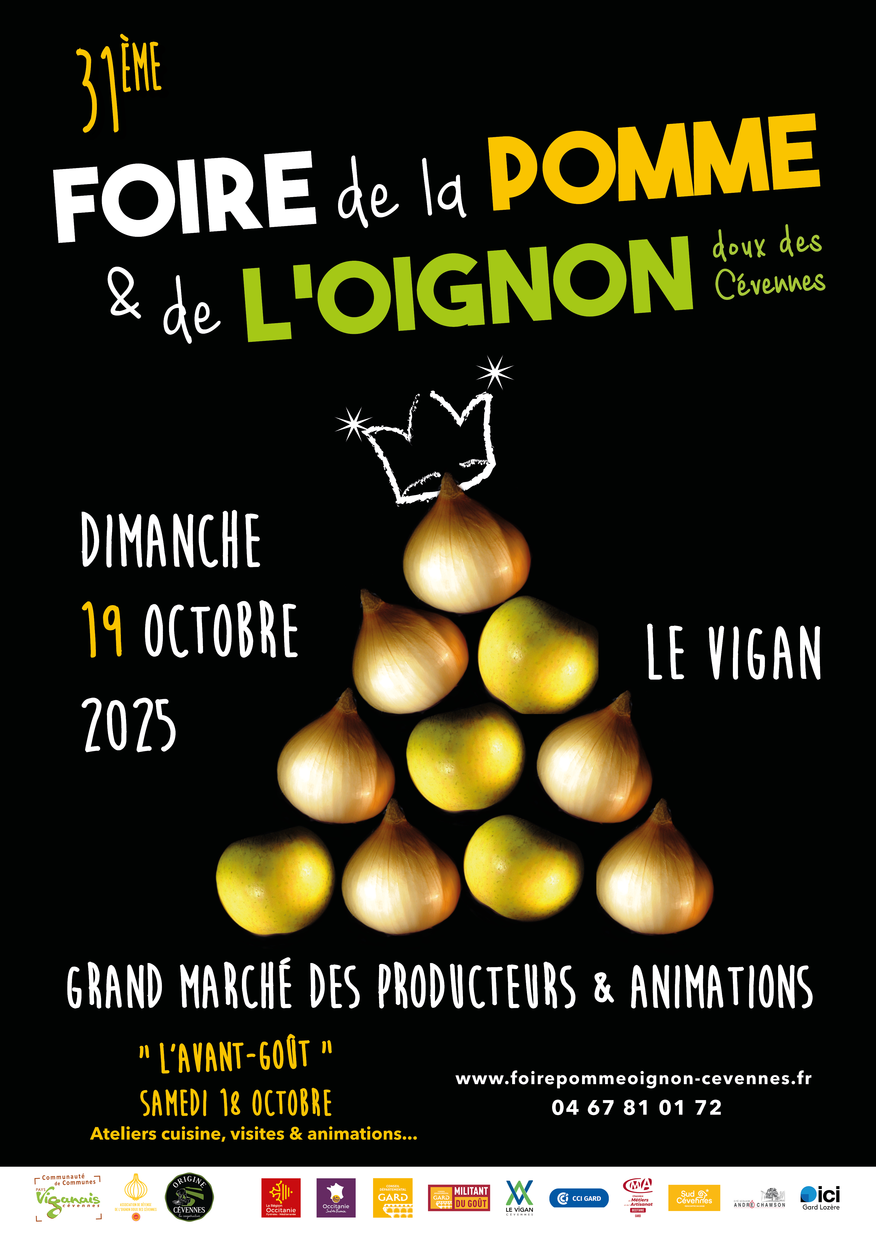 Le Vigan célèbre la 31e Foire de la Pomme et de l’Oignon, dimanche 19 octobre ! Grand marché, concerts, ateliers, mini-ferme et animations gourmandes pour petits et grands. Découvrez les saveurs cévenoles dans une ambiance festive.