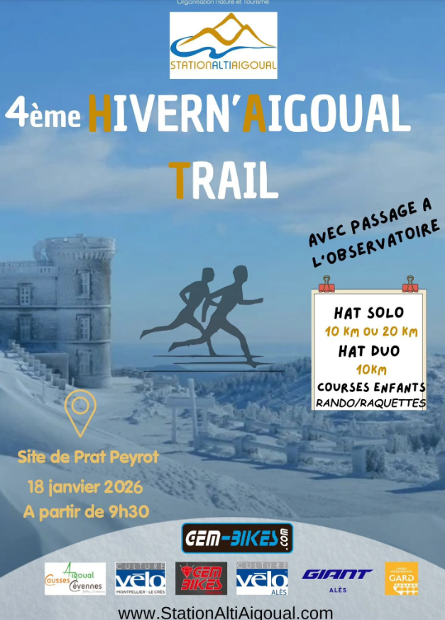 4éme édition de l’HIVERN’AIGOUAL TRAIL organisée par Station alti Aigoual ! Relevez le défi de l’hiver au Hivern’Aigoual Trail 2026 ! Le 18 janvier 2026, vivez l’aventure en montagne à la station de ski de Prat Peyrot, pour la 4ème édition de cette course mythique qui a pris la suite du Duo blanc de l’Aigoual !