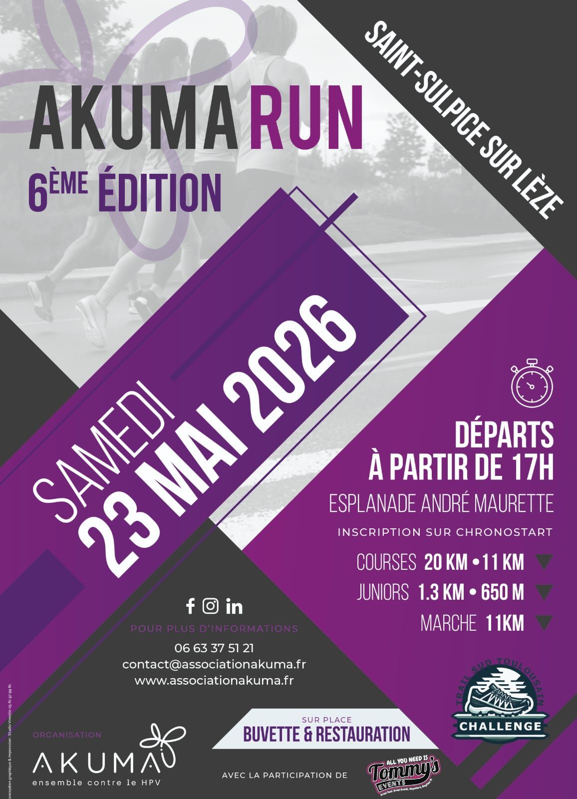 Programme : Rendez-vous le samedi 23 mai à partir de 17h à l’Esplanade André Maurette à Saint-Sulpice-sur-Lèze. Au programme : – Courses – 20km – 11 km – Juniors : 1.3km – 650 m – Marche : 11km – Sur place : buvette et restauration – Inscriptions sur chronostart