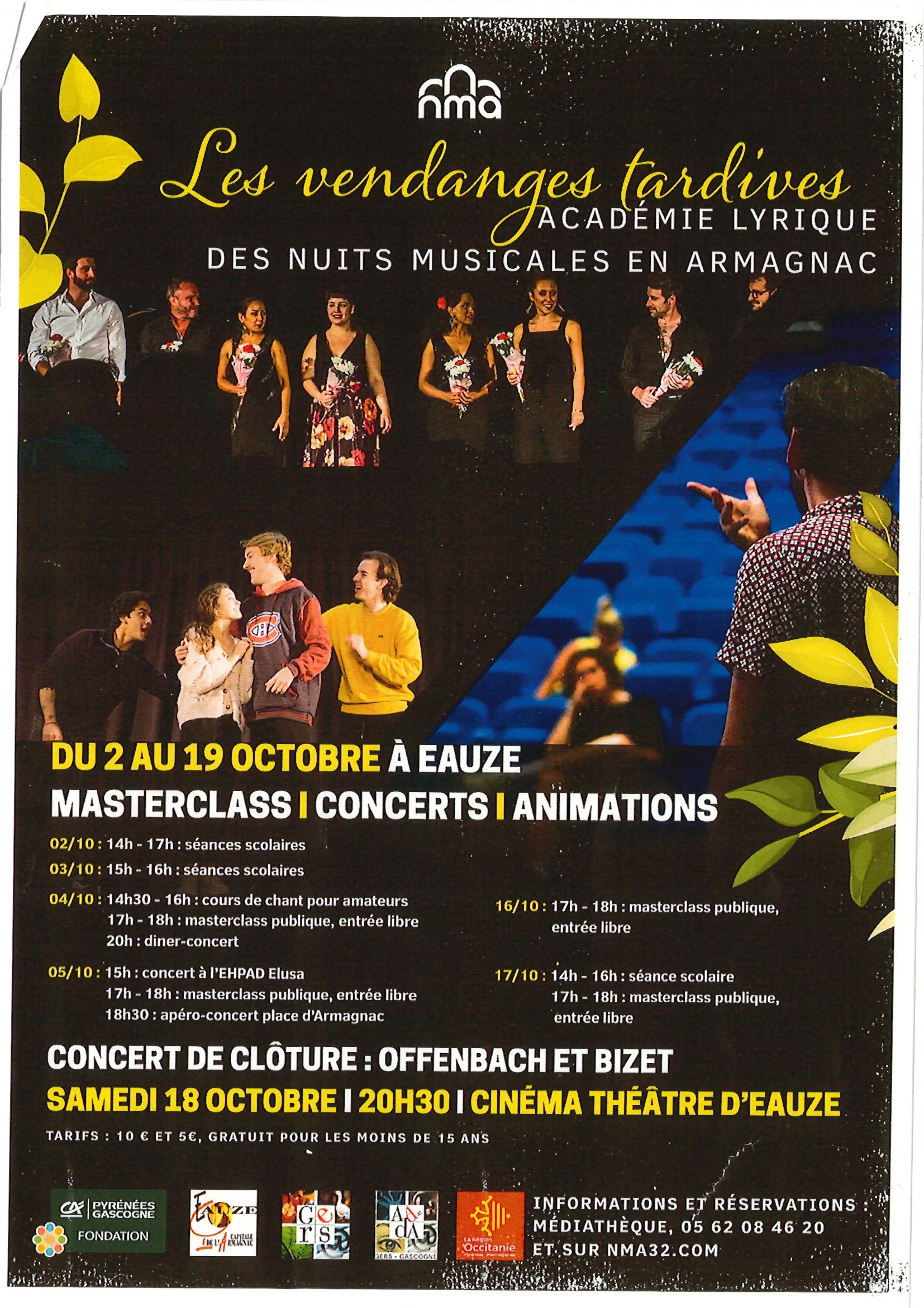 Samedi 18 octobre à 20h30 au cinéma théâtre Concert de clôture des deux sessions de formation, six jeunes chanteurs lyriques se produisent aux côtés de la Compagnie des Cadets, des sopranos Clémence Garcia et Aurélie Fargues, des choristes élusates et de la Maîtrise de Saint-Taurin.