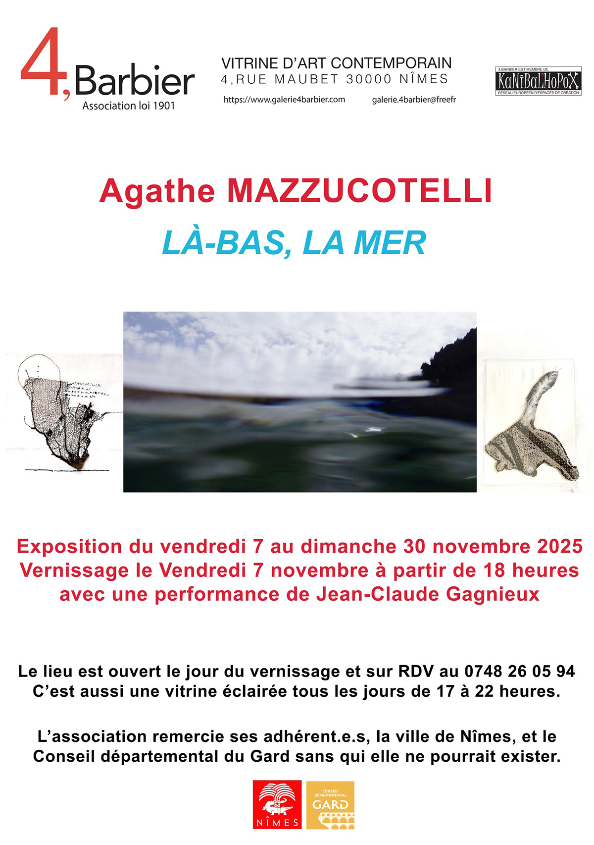 Exposition, Là-bas, la mer, Agathe Mazzucotelli. Vernissage le vendredi 7 novemnbre avec une performance de Jean-Claude Gagnieux.