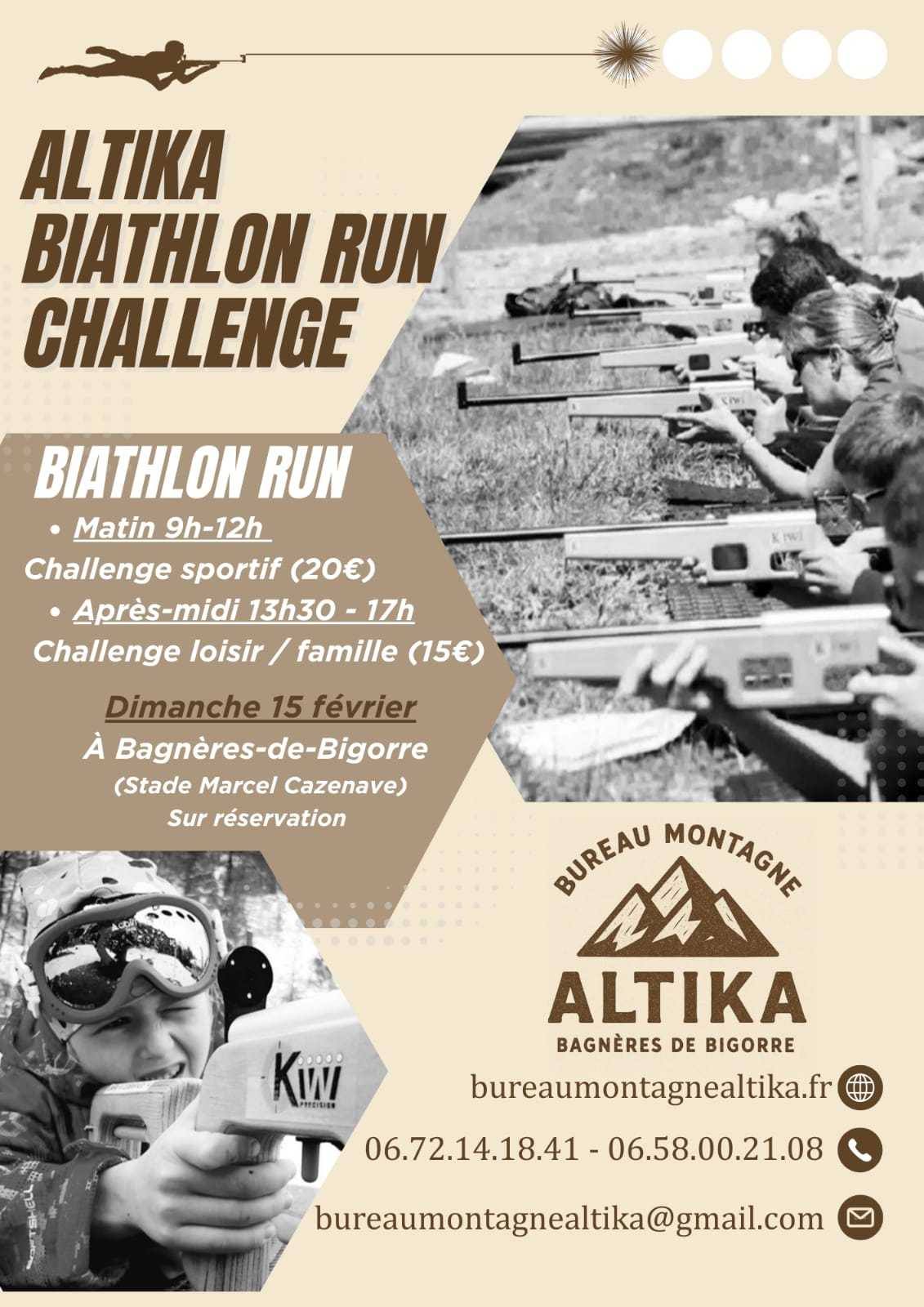 Participez au Altika Biathlon Run Challenge le 15 février à Bagnères-de-Bigorre ! Matin : challenge sportif (20€), après-midi : challenge loisir/famille (15€). Réservation obligatoire. Contact et infos : téléphone et site web.