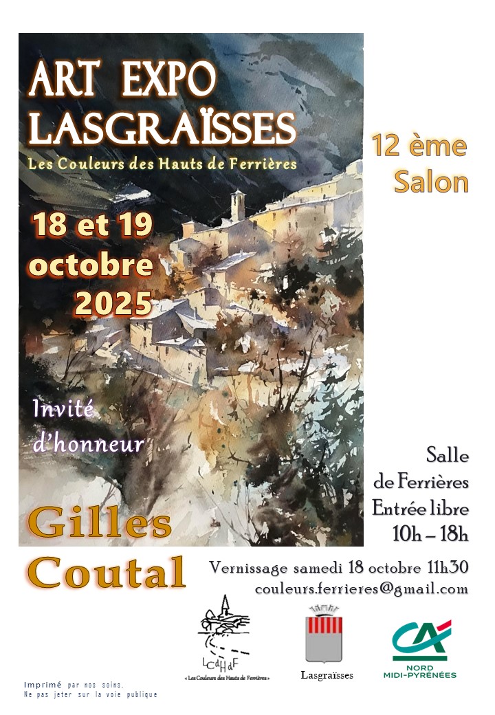 L’association « Les Couleurs des Hauts De Ferrières » accueille pour son 12ème salon, ART EXPO Lasgraïsses, de nombreux peintres et sculpteurs, professionnels ou amateurs . L’invité d’honneur est Gilles Coutal , aquarelliste. 2 démonstrations aquarelle au programme les après-midi de samedi avec Gilles Coutal et dimanche avec François Perry. Une soixantaine d’exposants entourent Gilles Coutal membre de la société française de l’aquarelle . Diversité des techniques, des thèmes, foisonnement de couleurs. Un rendez-vous culturel en milieu rural sur 2 jours, 18 et 19 octobre, à ne pas manquer.
