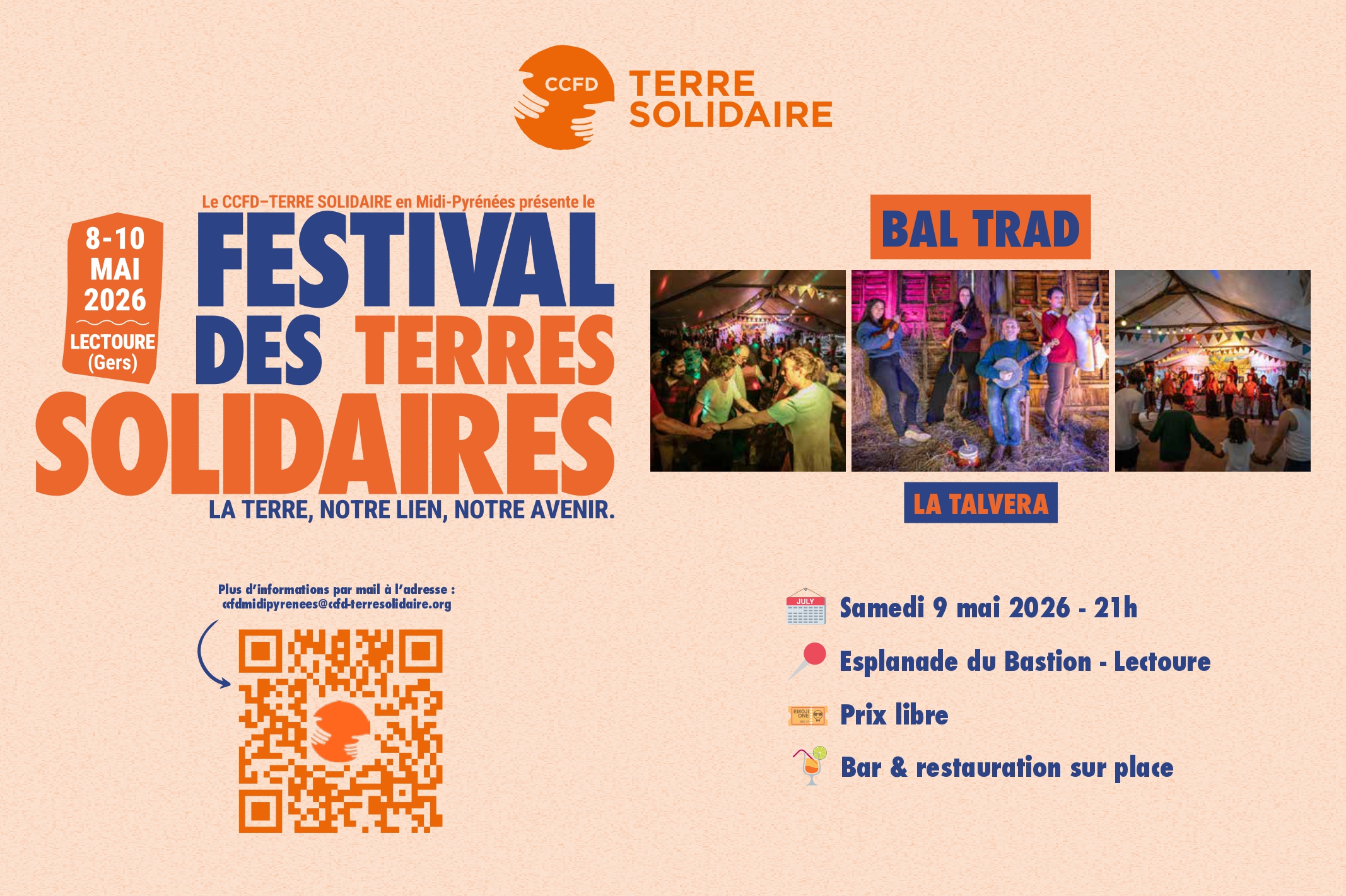 Dans le cadre du Festival des terres solidaires, la terre, notre lien, notre avenir, un Bal Trad est organisé sur l’esplanade du Bastion. Prix libre. Buvette et restauration sur place.