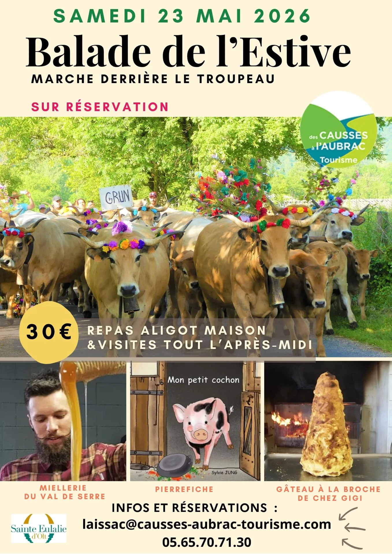 Balade au cœur de l’Estive. Venez suivre un troupeau partant en transhumance vers l’Aubrac. Renseignement et réservation obligatoire au : 05 65 70 71 30.