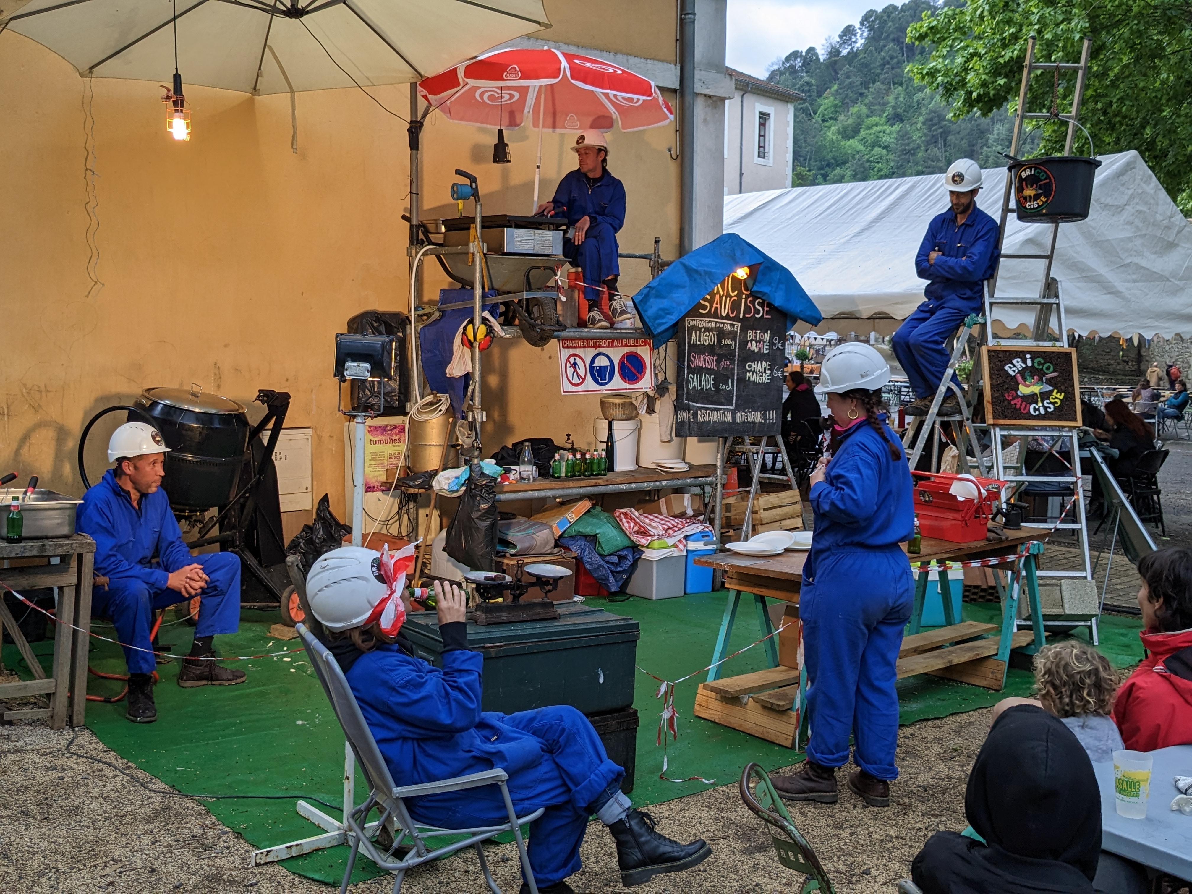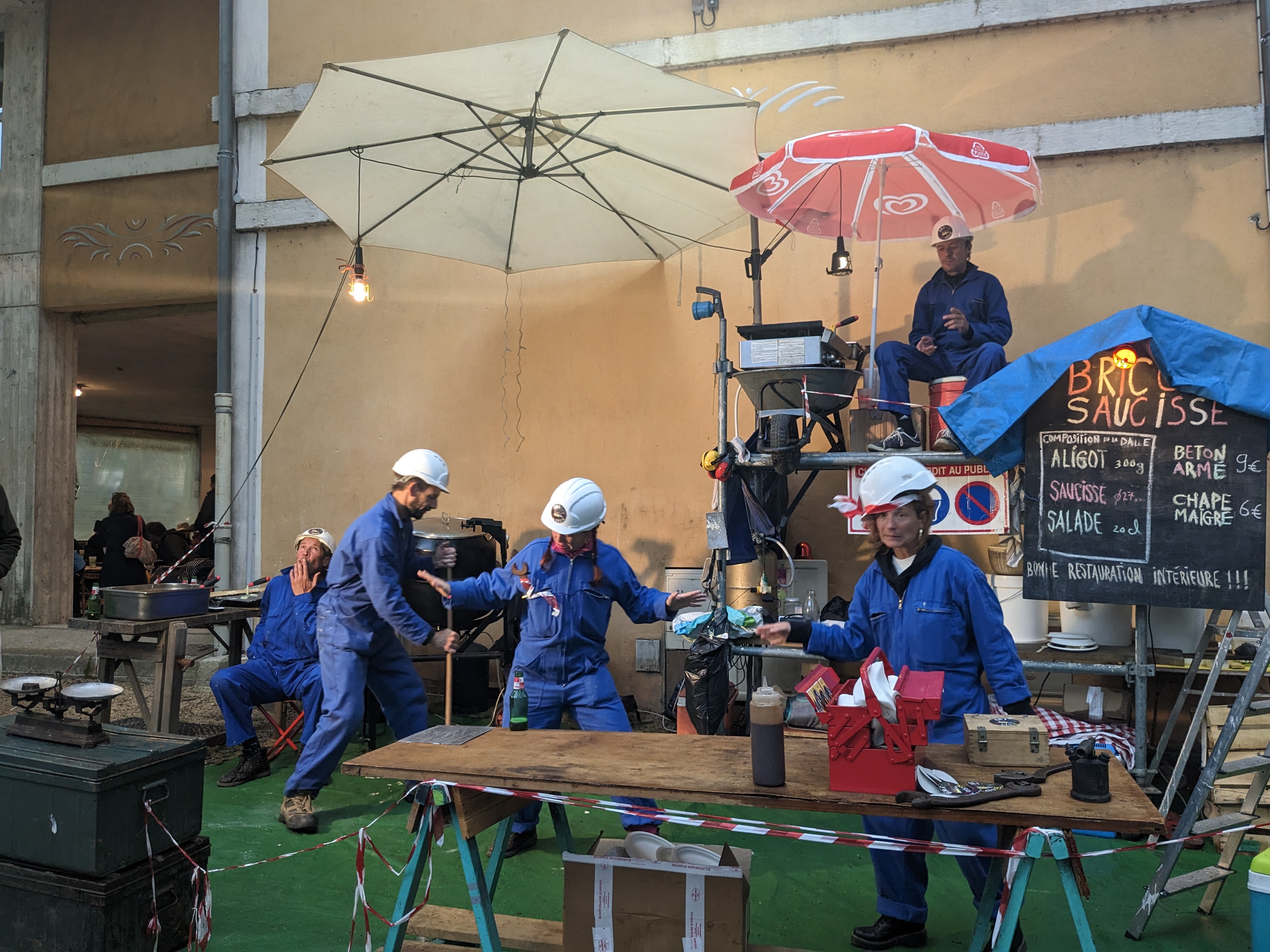 Servis à la truelle et à la taloche par des maçons-cuisiniers intrépides dans un décor de chantier aux normes de sécurité et d’hygiène, vos 300g d’aligot seront accompagnés d’une saucisse de 12cm/3cm cuite sur une plancha incrustée dans une brouette à gaz. Quelques feuilles de salade de 0,01mm d’épaisseur ainsi qu’un bidon d’huile seront bien sûr à votre disposition pour faire glisser le tout.