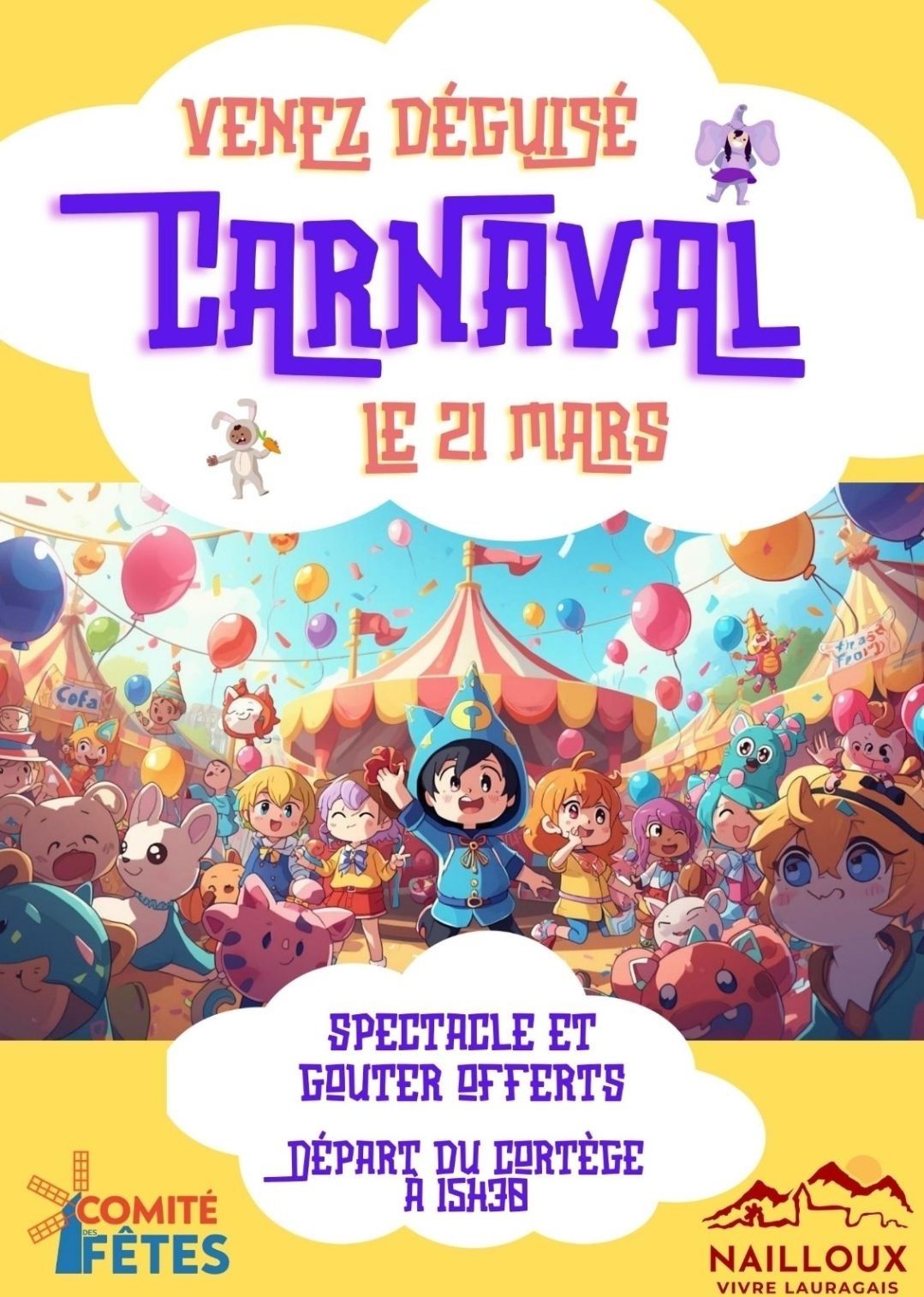 Le Carnaval de Nailloux est dédié spécialement aux animés pour ce Samedi 21 mars 2026, donc rendez-vous à 15h30 sur la place du village pour un programme :