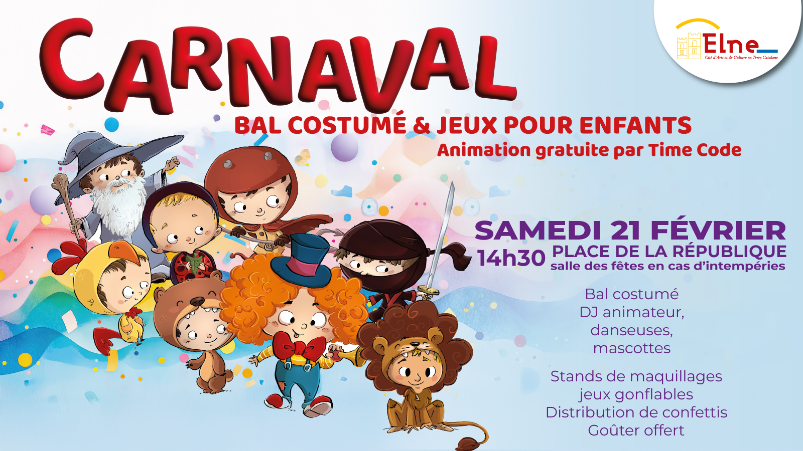 Dj animateur, danseuses, mascottes, stands maquillage, jeux gonflables, distribution de confettis. Goûter offert.