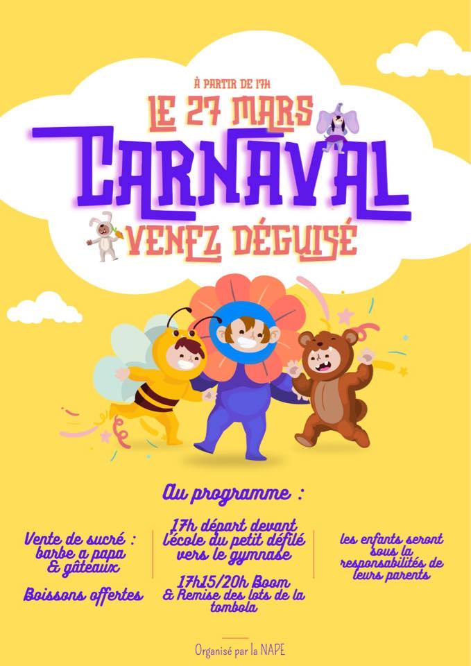 Programme : Rendez-vous le vendredi 27 mars à 17h à l’école de Noé. Au programme : – 17h : départ devant l’école du petit défilé – 17h15 / 20h : Boom et remise des lots de la tombola – Vente de sucré : barbe à papa et gâteaux – Boissons offertes.