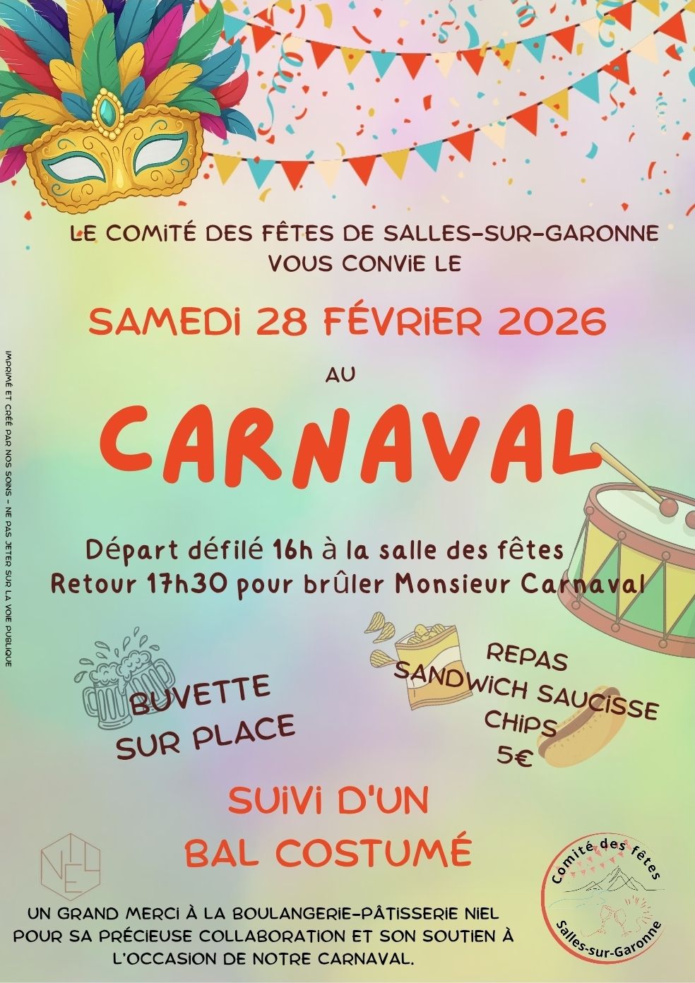 Programme : Rendez-vous le samedi 28 février à 16h à Salles-sur-Garonne. Au programme : – Départ du défilé costumé à 16h – Retour à 17h30 pour brûler Monsieur Carnaval – Bal costumé – Buvette sur place – Restauration : sandwichs saucisse, chips : 5€