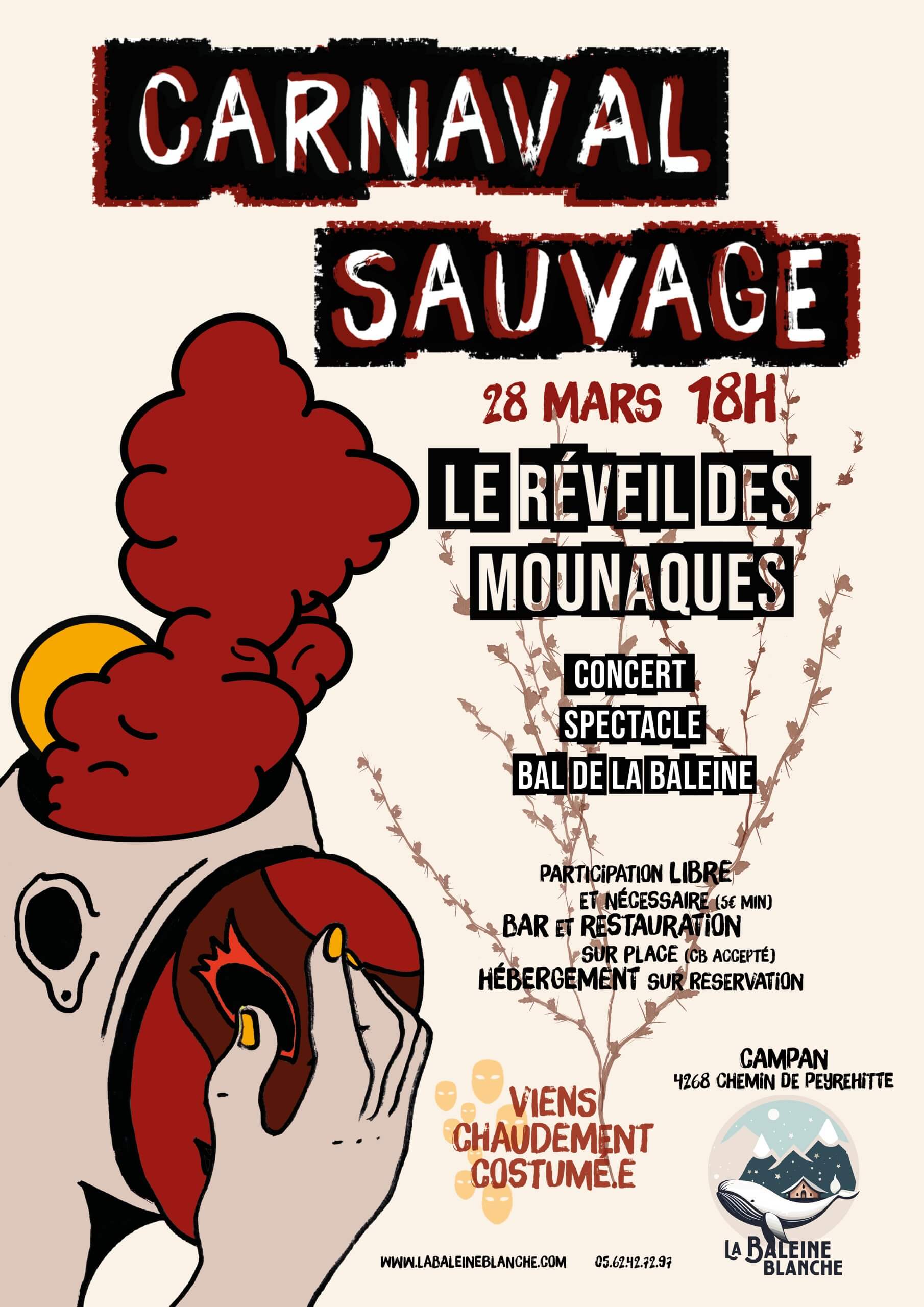 Plongez dans l’ambiance festive du Carnaval Sauvage ! À l’occasion du “Réveil des Mounaques”, profitez d’une soirée conviviale mêlant concert, spectacle et bal de la baleine. Venez chaudement costumé·e pour célébrer ensemble dans une atmosphère chaleureuse et décalée !