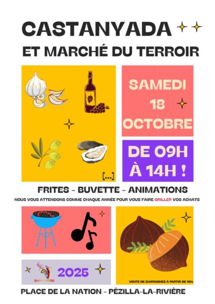 Au programme : Vente de châtaignes à partir de 10h. Nous vous attendons comme chaque année pour faire griller vos achats vers midi. Marché du terroir avec des produits locaux (ail, vin, huiles d’olives, huîtres, crêpes, etc.). Animations et ambiance festive, avec : Le duo musical Iris Coffee Jeux pour enfants (structure gonflable, etc.). Buvette sur place.