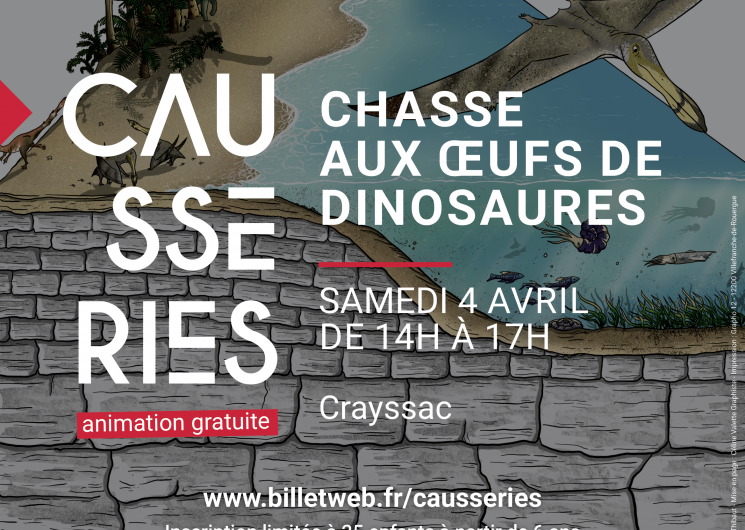 ÉVÈNEMENT – CAUSSERIE Le Parc naturel régional des Causses du Quercy – Géoparc mondial Unesco vous propose dans le cadre de ses animations culturelles : LES CAUSSERIES. Après une chasse aux œufs de dinosaures et la résolution de petites énigmes, tu en sauras beaucoup sur les animaux marins qui peuplaient le Quercy au Jurassique. Dinosaures, ptérosaures et autres pliosaures seront à l’honneur. Un goûter inédit clôturera l’après-midi, avec un chocolat pas comme les autres : une géotablette fabriquée par un artisan chocolatier avec une représentation des animaux disparus de notre territoire. En partenariat avec la Plage aux Ptérosaures, l’Ichnospace de Luzech et la Chambre des Métiers et de l’Artisanat du Lot.Animation est aussi en collaboration avec l'Ichnospace de Luzech.