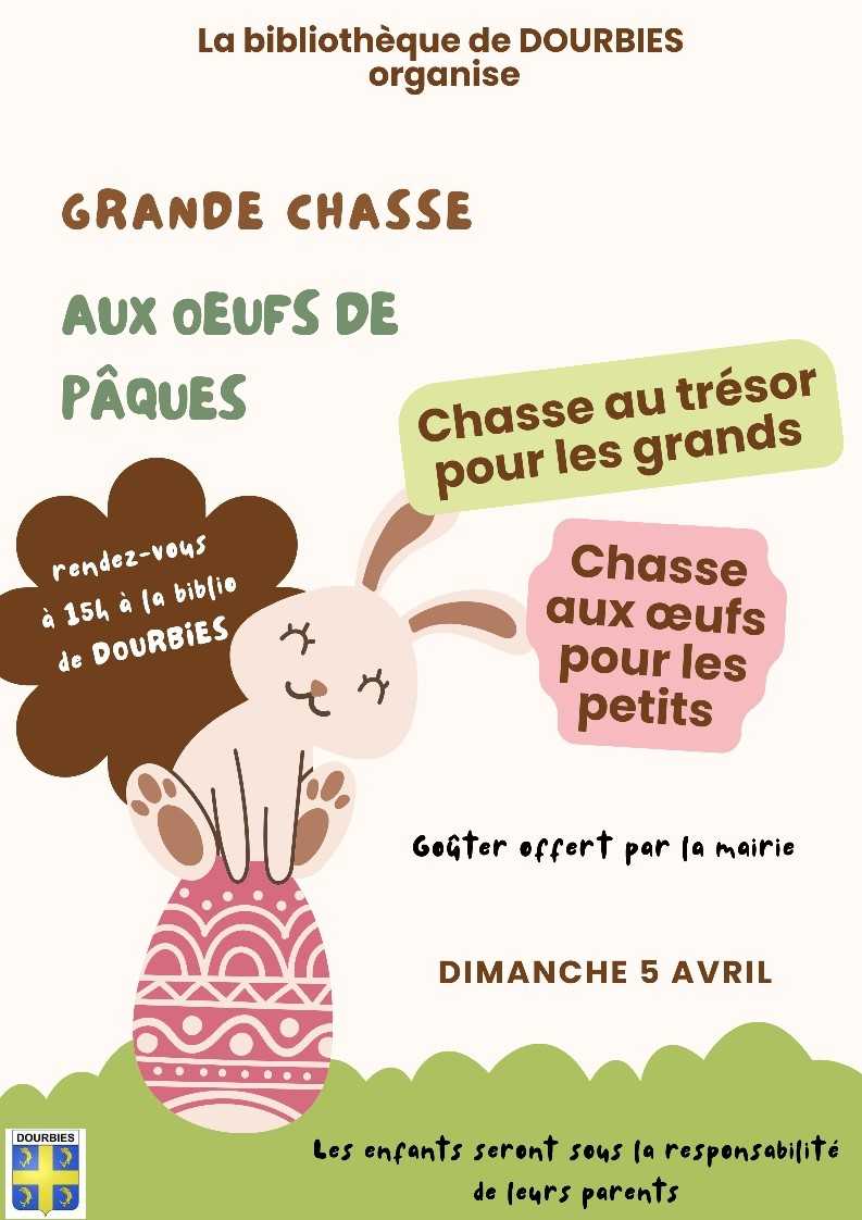 La bibliothèque de Dourbies organise La Chasse aux œufs de Pâques, à partir de 15h à la bibliothèque : chasse au trésor pour les grands, chasse aux œufs pour les petits. Ouvert à tous.