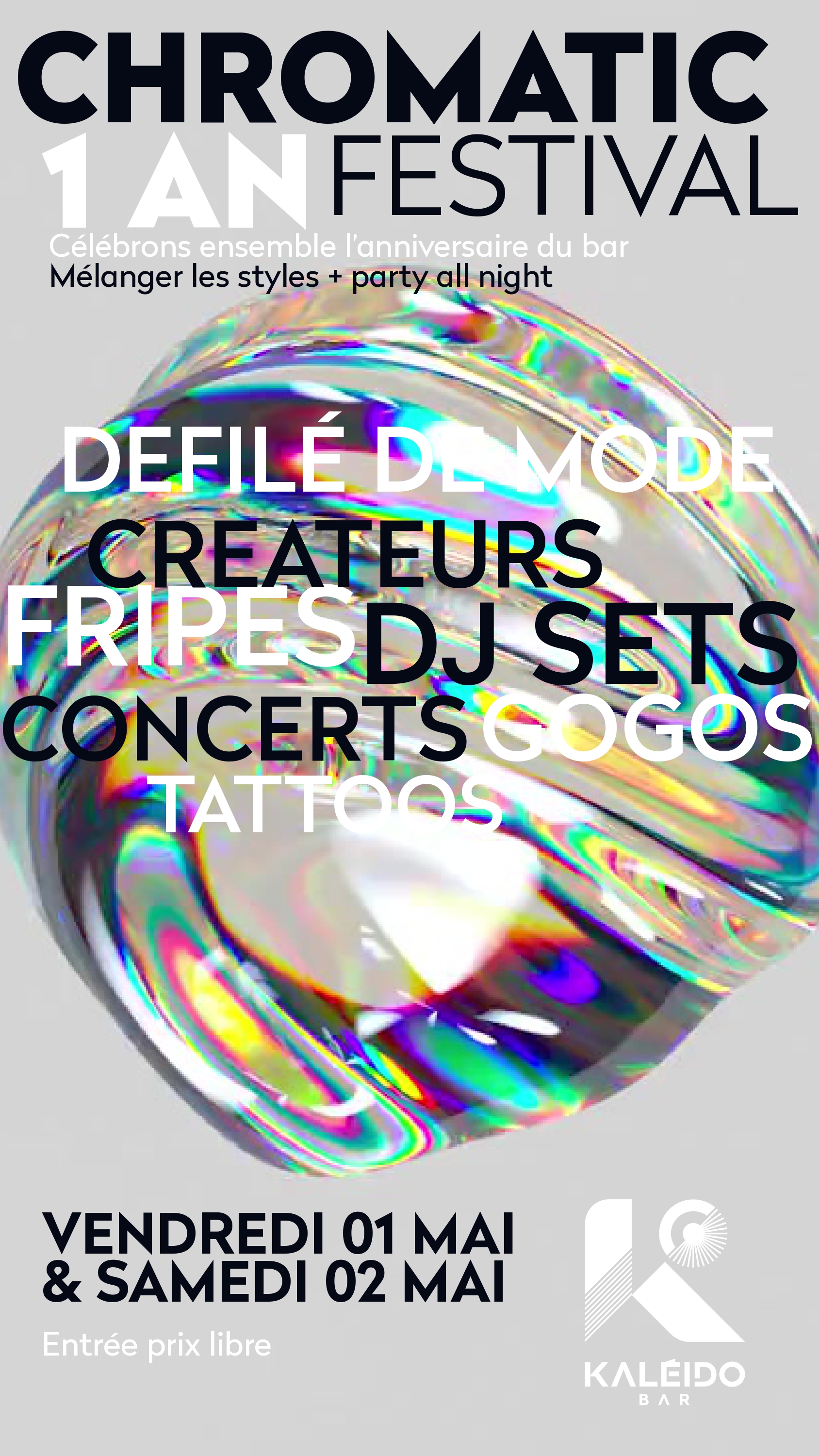 Pour fêter ses 1 an, le Kaleido Bar organise le CHROMATIC FESTIVAL afin de partager ce qui nous fait vibrer, la diversité des styles, dans la bonne humeur, la bienveillance, pour que tout le monde reparte avec un énorme sourire sur son visage.