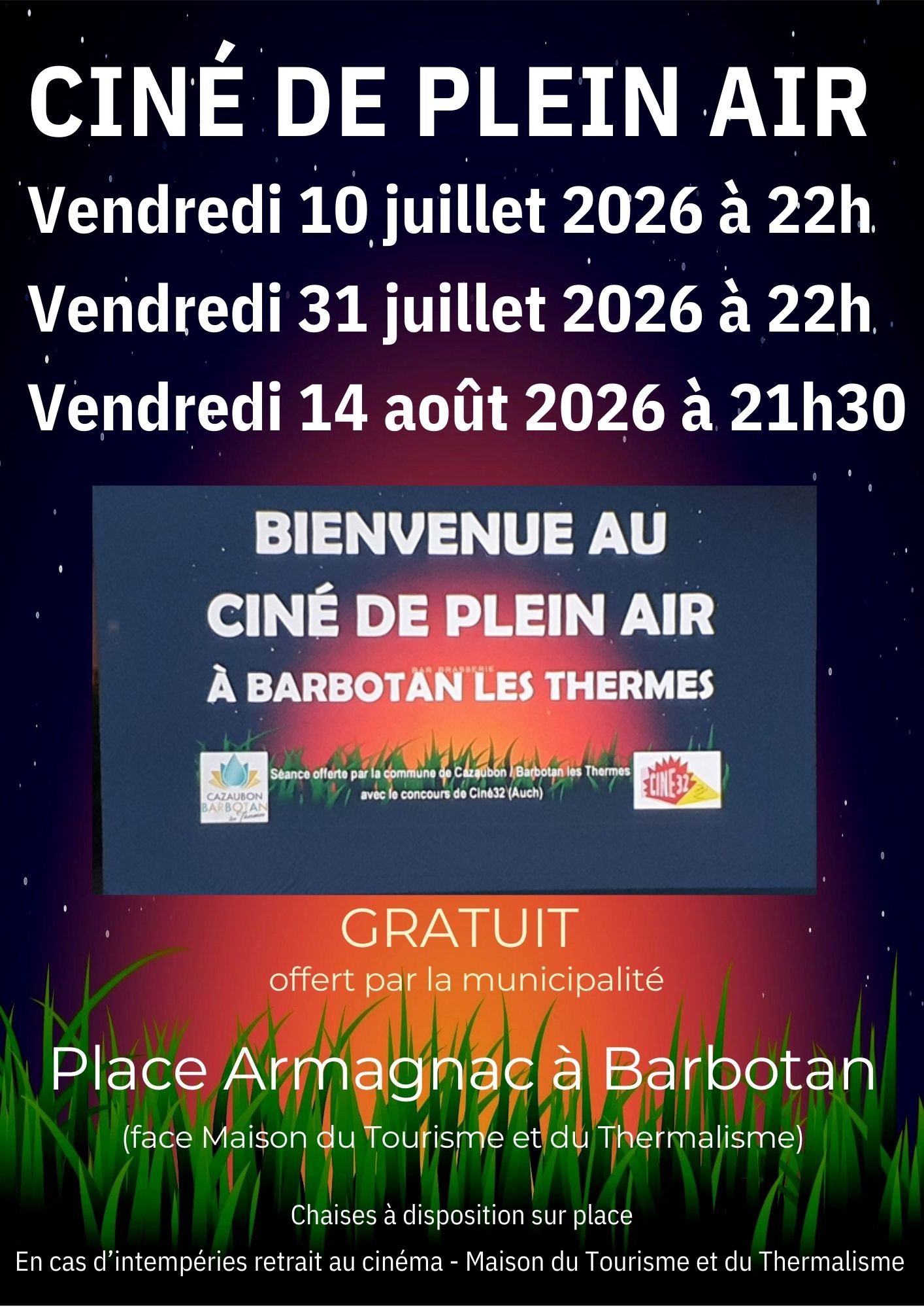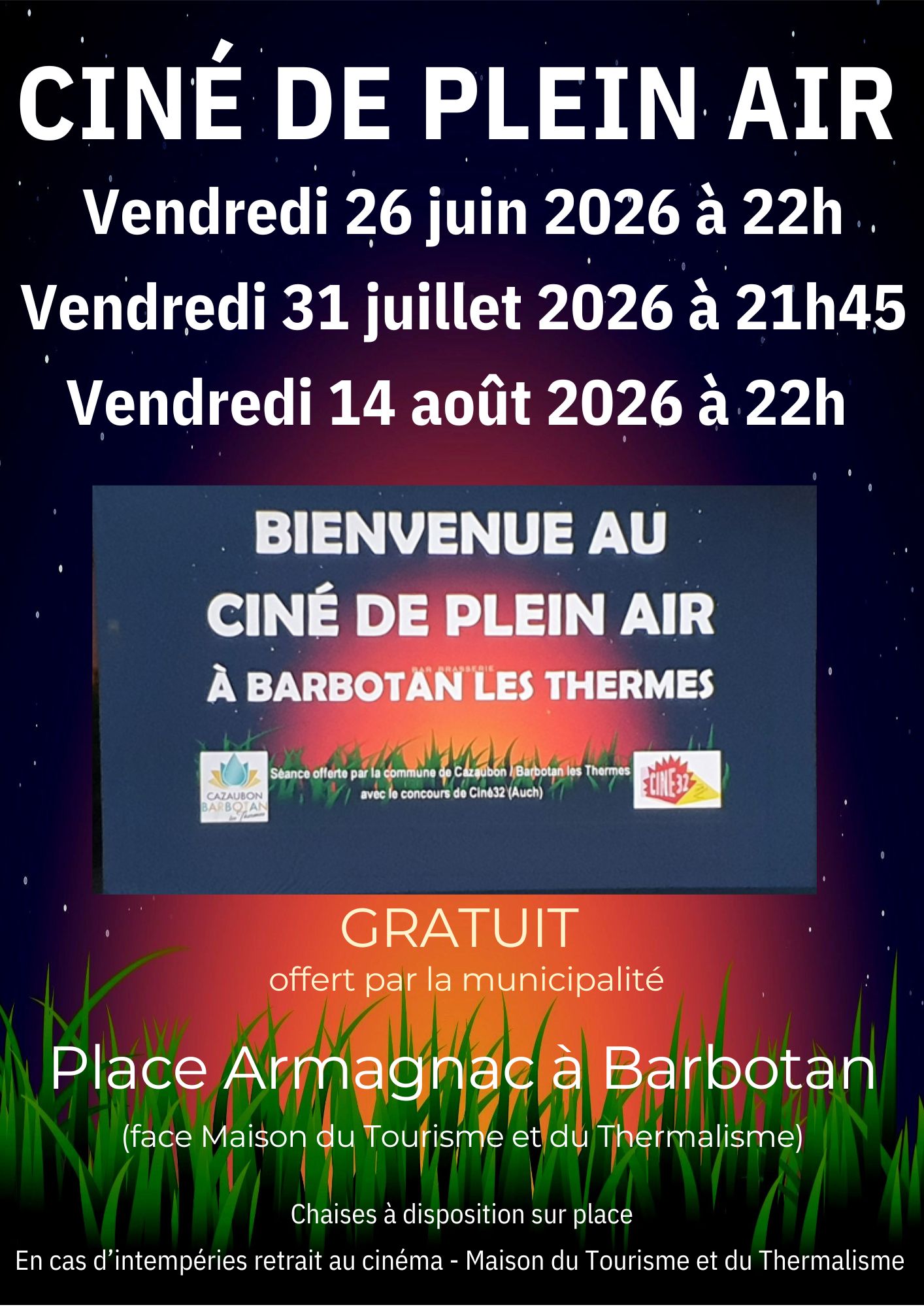 Cinéma en plein air sur la Place Armagnac de Barbotan les Thermes, organisé par le Cinéma Armagnac de Barbotan les Thermes.