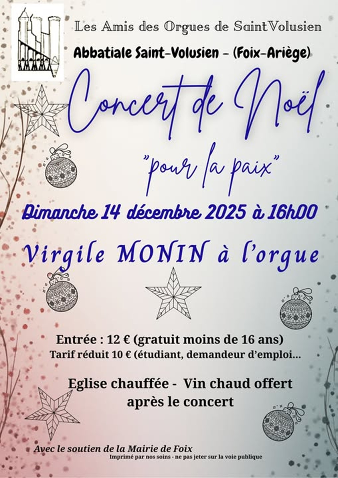 Les Amis des Orgues de Saint-Volusien proposent un concert de Noël « Pour la paix » avec Virgile Monin à l’orgue.