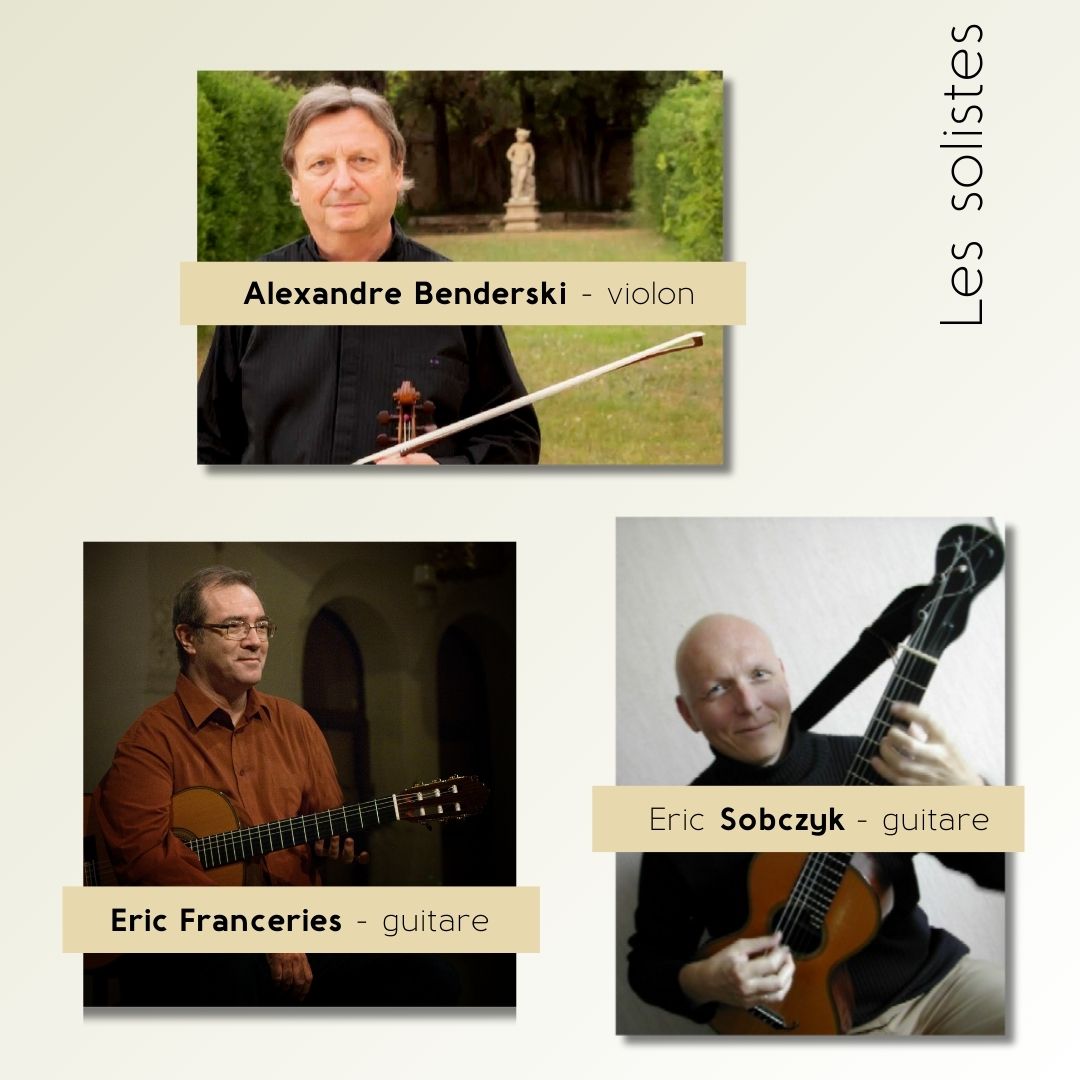 Les trois solistes de L’Orchestre de chambre du Languedoc : Eric FRANCERIES, Eric SOBCZYK, guitares, et Alexandre BENDERSKI, violon.