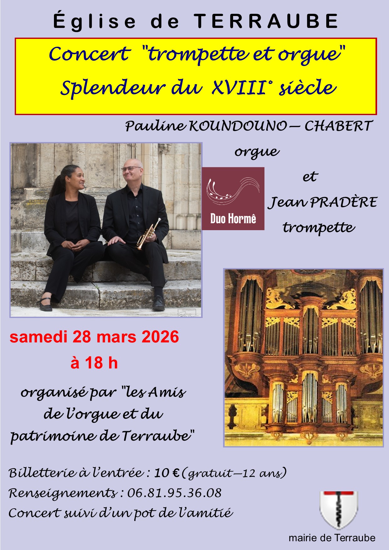 Venez assister à un concert exceptionnel de trompette et orgue, mettant en lumière la splendeur du XVIIIe siècle. Pauline Koundouno-Chabert à l’orgue et Jean Pradère à la trompette vous feront voyager à travers les mélodies de cette époque. L’événement est organisé par « les Amis de l’orgue et du patrimoine de Terraube » et sera suivi d’un pot de l’amitié.