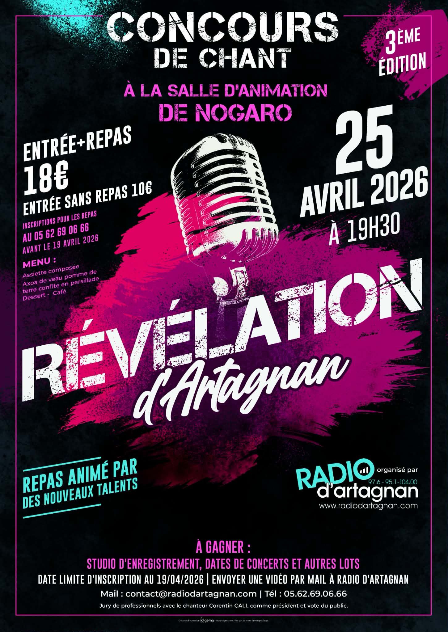 Concours de chant « Révélation d’Artagnan » à la salle d’animation de Nogaro. Repas animé par des nouveaux talents. À gagner : studio d’enregistrement, dates de concerts et autres lots.