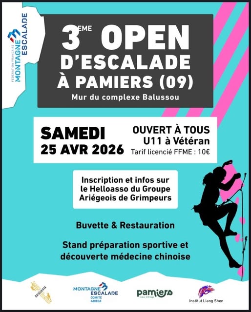 Concours d’escalade du GAG à Pamiers en Ariège pour la 3ème édition. La compétition est ouverte des catégories U11 à Vétéran 2, ainsi qu’une catégorie para escalade pour les adultes à partir de 19 ans.