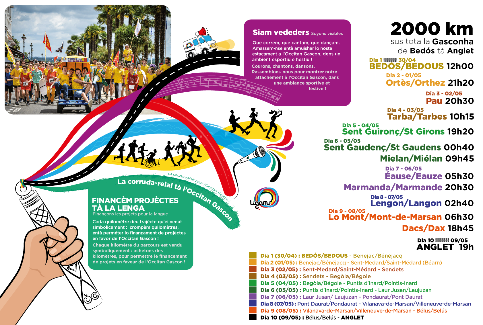 La Passem! revient en 2026 avec une course relais non compétitive de 2000 km, célébrant l’Occitan Gascon. Cet événement festif se déroulera du 30 avril au 9 mai, reliant Bedous à Anglet et traversant 9 territoires.