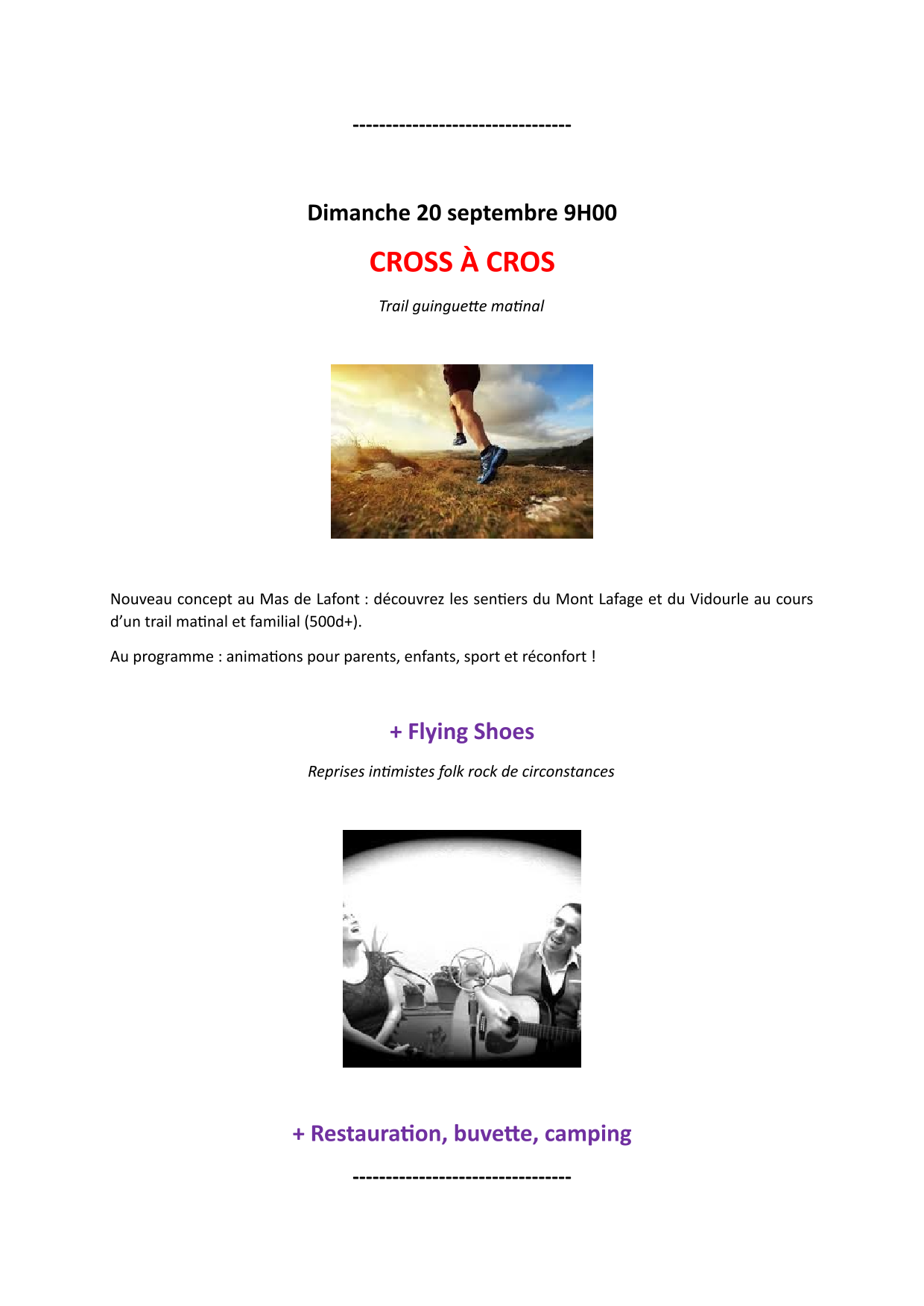 Rendez-vous au Mas de Lafont le dimanche 20 septembre dès 9h pour le Cross à Cros, un trail guinguette matinal et familial sur les sentiers du Mont Lafage et du Vidourle ! Suivi du concert folk rock de Flying Shoes. Restauration et camping.