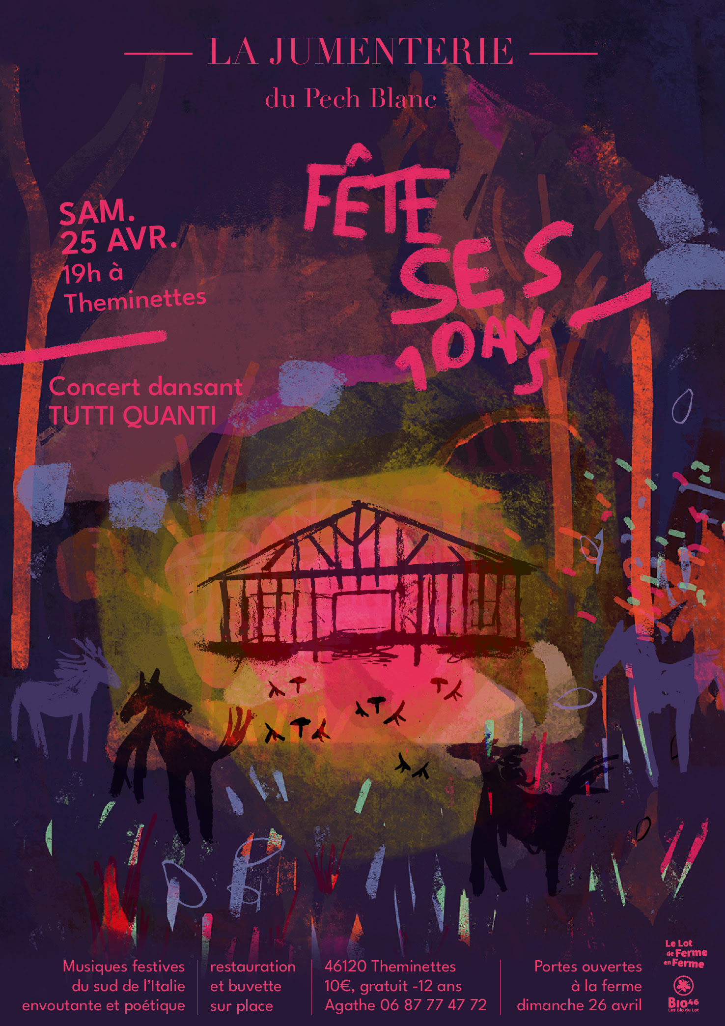 Notre ferme fête ses 10 ans le samedi 25 avril dans le cadre du week-end de Fermes en Fermes organisé par l'association BIO46. Nous souhaitons vous associer à cet évènement qui n'existerait pas sans vous!Rendez vous le samedi soir pour un voyage aux couleurs de l'Italie avec le groupe Tutti Quanti qui rythmera cette belle soirée!